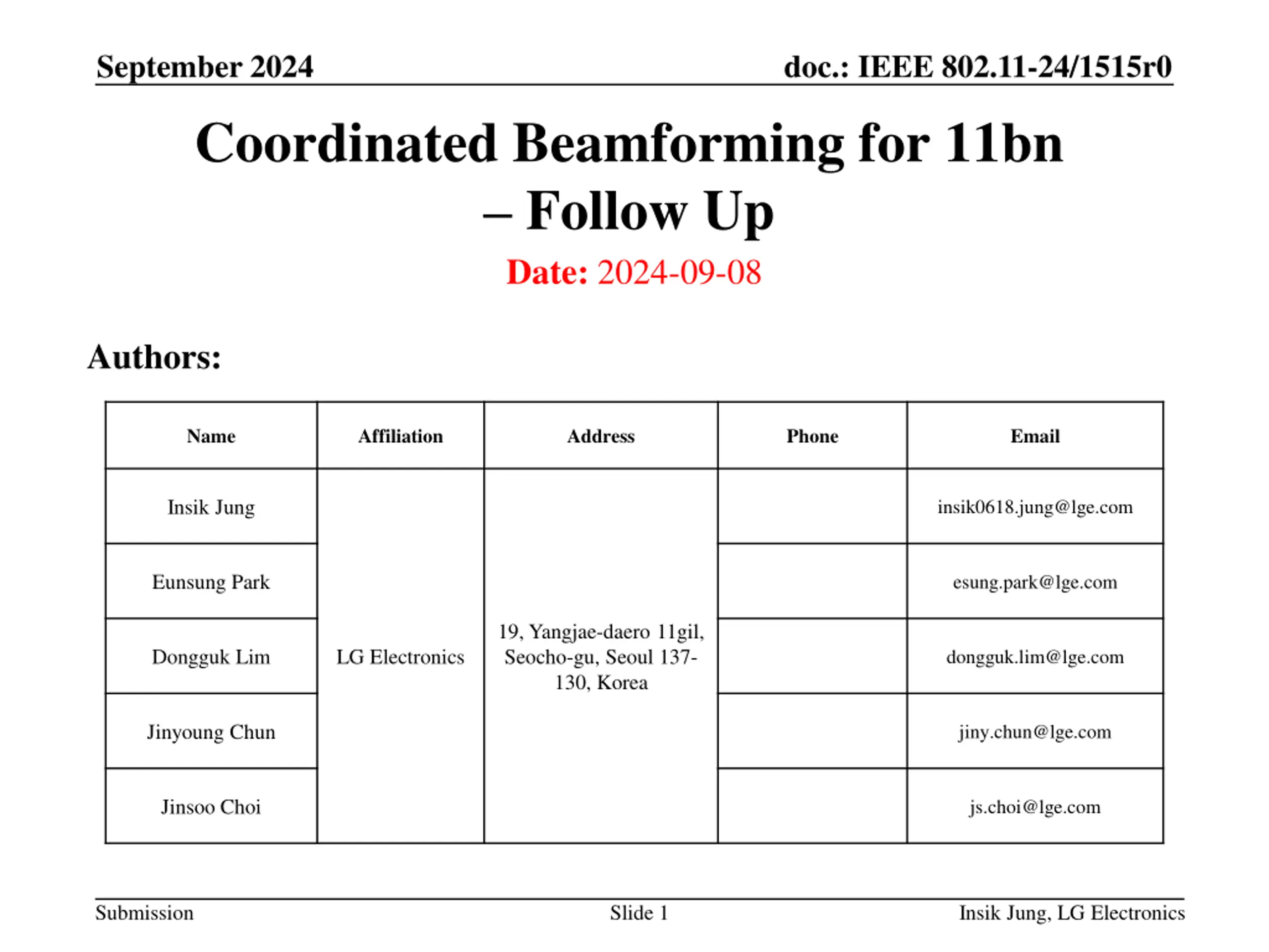 September 2024 doc.: IEEE 802.11-24/1515r0 Coordinated Beamforming for 11bn Follow Up Date: 2024-09-08 Authors: Name Affiliation Address Phone Email Insik Jung insik0618.jung@lge.com Eunsung Park esung.park@lge.com 19, Yangjae-daero 11gil, Seocho-gu, Seoul 137- 130, Korea Dongguk Lim LG Electronics dongguk.lim@lge.com Jinyoung Chun jiny.chun@lge.com Jinsoo Choi js.choi@lge.com Submission Slide 1 Insik Jung, LG Electronics