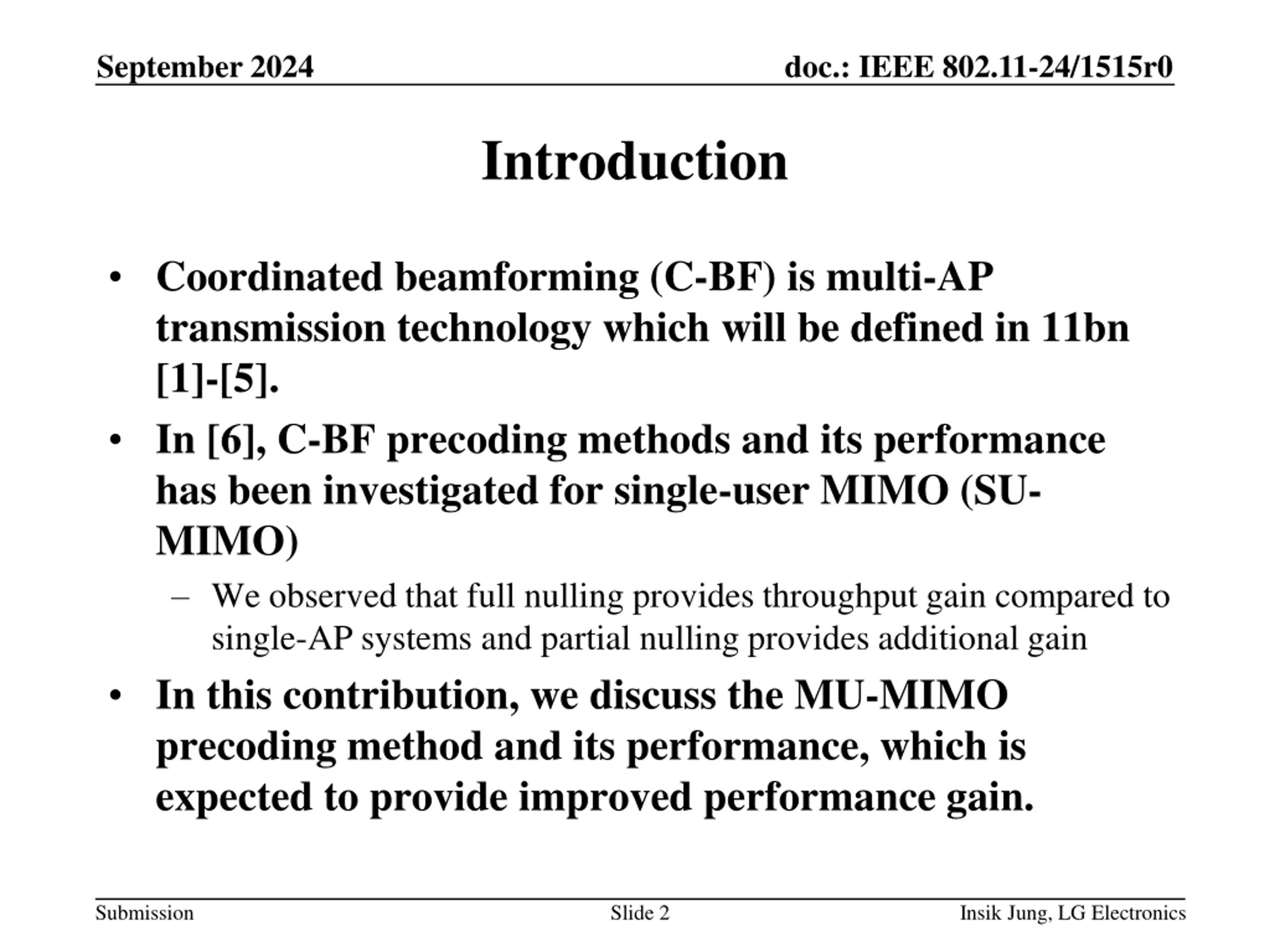 September 2024 doc.: IEEE 802.11-24/1515r0 Introduction Coordinated beamforming (C-BF) is multi-AP transmission technology which will be defined in 11bn [1]-[5]. In [6], C-BF precoding methods and its performance has been investigated for single-user MIMO (SU- MIMO) We observed that full nulling provides throughput gain compared to single-AP systems and partial nulling provides additional gain In this contribution, we discuss the MU-MIMO precoding method and its performance, which is expected to provide improved performance gain. Submission Slide 2 Insik Jung, LG Electronics