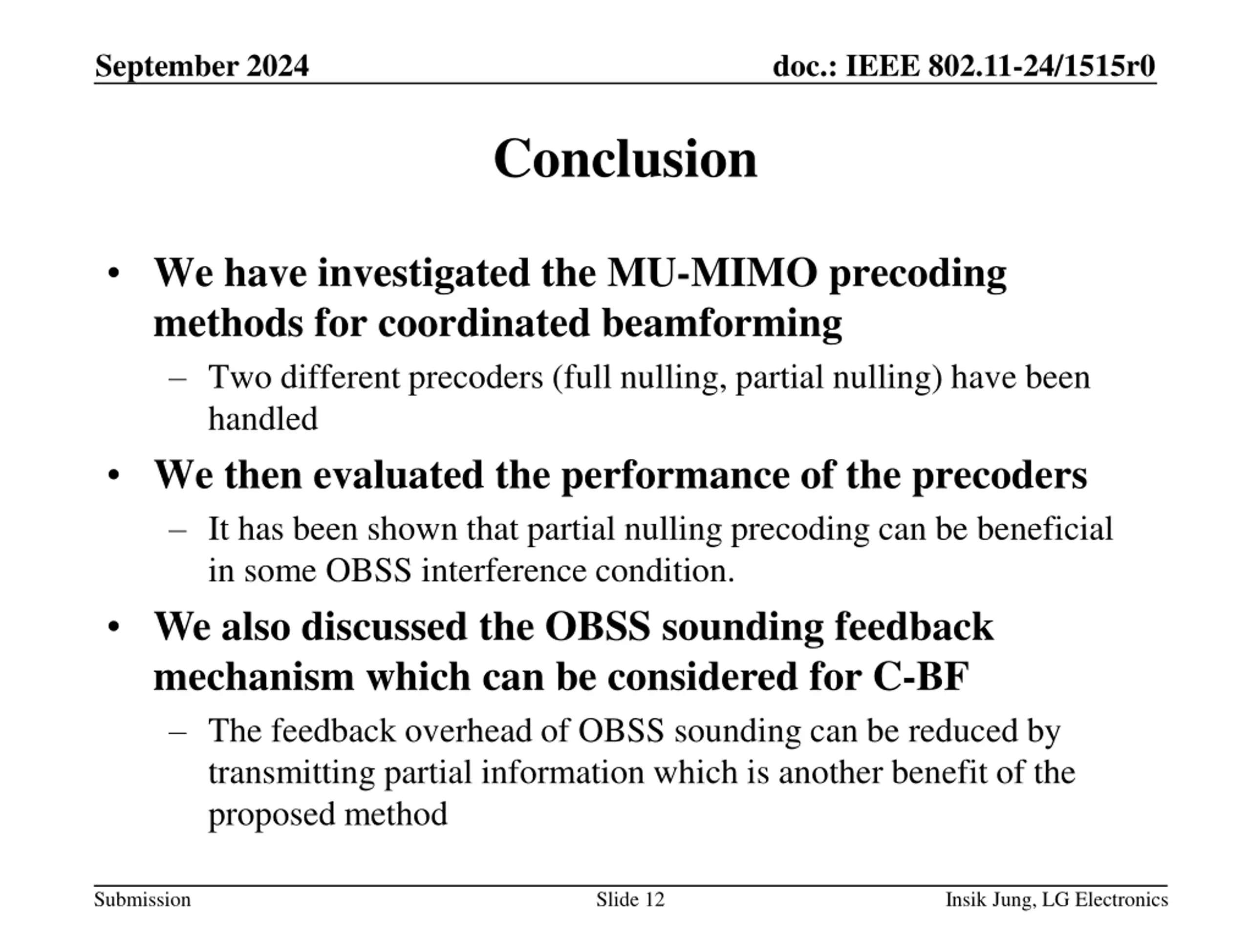 September 2024 doc.: IEEE 802.11-24/1515r0 Conclusion We have investigated the MU-MIMO precoding methods for coordinated beamforming Two different precoders (full nulling, partial nulling) have been handled We then evaluated the performance of the precoders It has been shown that partial nulling precoding can be beneficial in some OBSS interference condition. We also discussed the OBSS sounding feedback mechanism which can be considered for C-BF The feedback overhead of OBSS sounding can be reduced by transmitting partial information which is another benefit of the proposed method Submission Slide 12 Insik Jung, LG Electronics