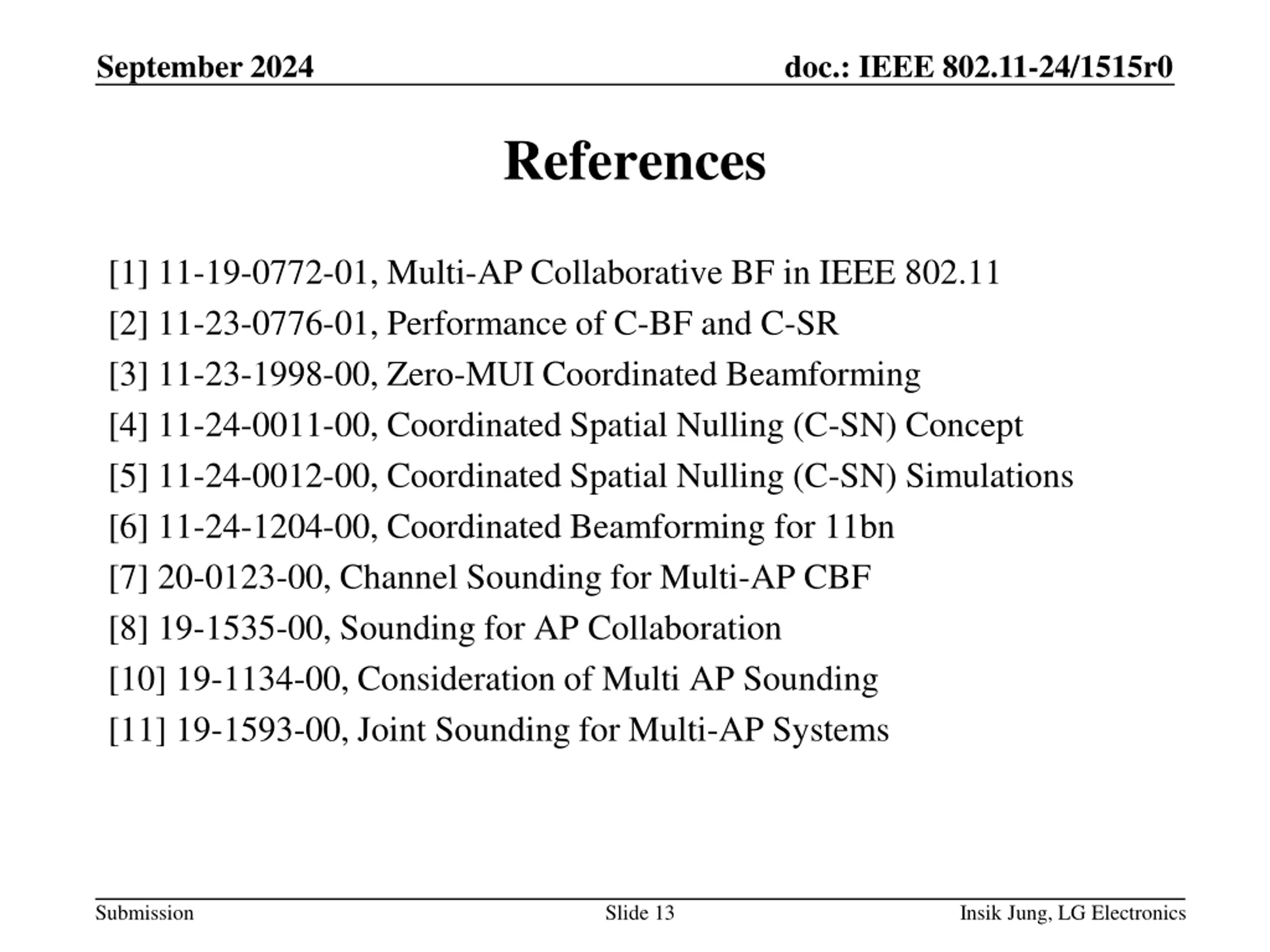 September 2024 doc.: IEEE 802.11-24/1515r0 References [1] 11-19-0772-01, Multi-AP Collaborative BF in IEEE 802.11 [2] 11-23-0776-01, Performance of C-BF and C-SR [3] 11-23-1998-00, Zero-MUI Coordinated Beamforming [4] 11-24-0011-00, Coordinated Spatial Nulling (C-SN) Concept [5] 11-24-0012-00, Coordinated Spatial Nulling (C-SN) Simulations [6] 11-24-1204-00, Coordinated Beamforming for 11bn [7] 20-0123-00, Channel Sounding for Multi-AP CBF [8] 19-1535-00, Sounding for AP Collaboration [10] 19-1134-00, Consideration of Multi AP Sounding [11] 19-1593-00, Joint Sounding for Multi-AP Systems Submission Slide 13 Insik Jung, LG Electronics