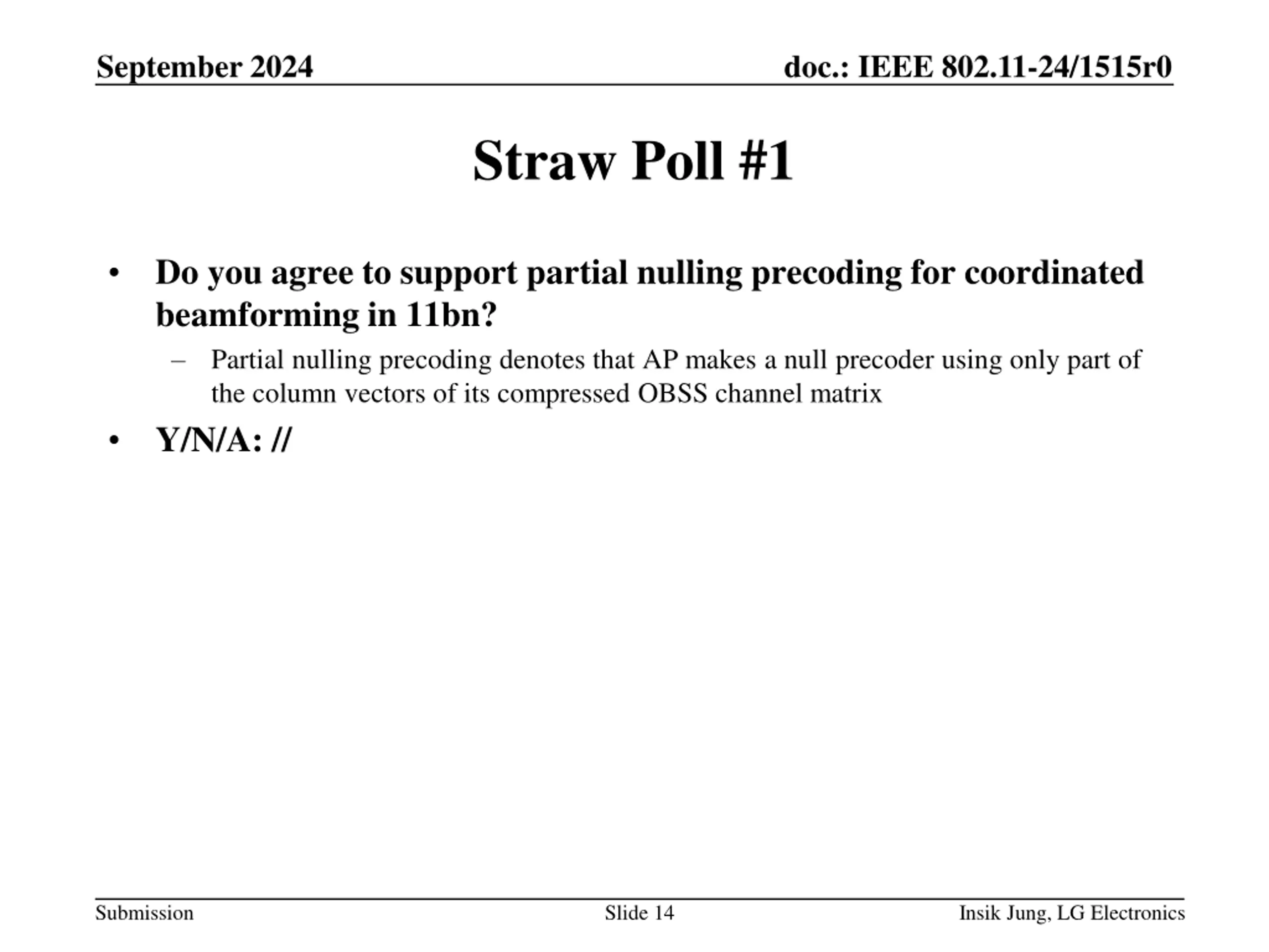 September 2024 doc.: IEEE 802.11-24/1515r0 Straw Poll #1 Do you agree to support partial nulling precoding for coordinated beamforming in 11bn? Partial nulling precoding denotes that AP makes a null precoder using only part of the column vectors of its compressed OBSS channel matrix Y/N/A: // Submission Slide 14 Insik Jung, LG Electronics