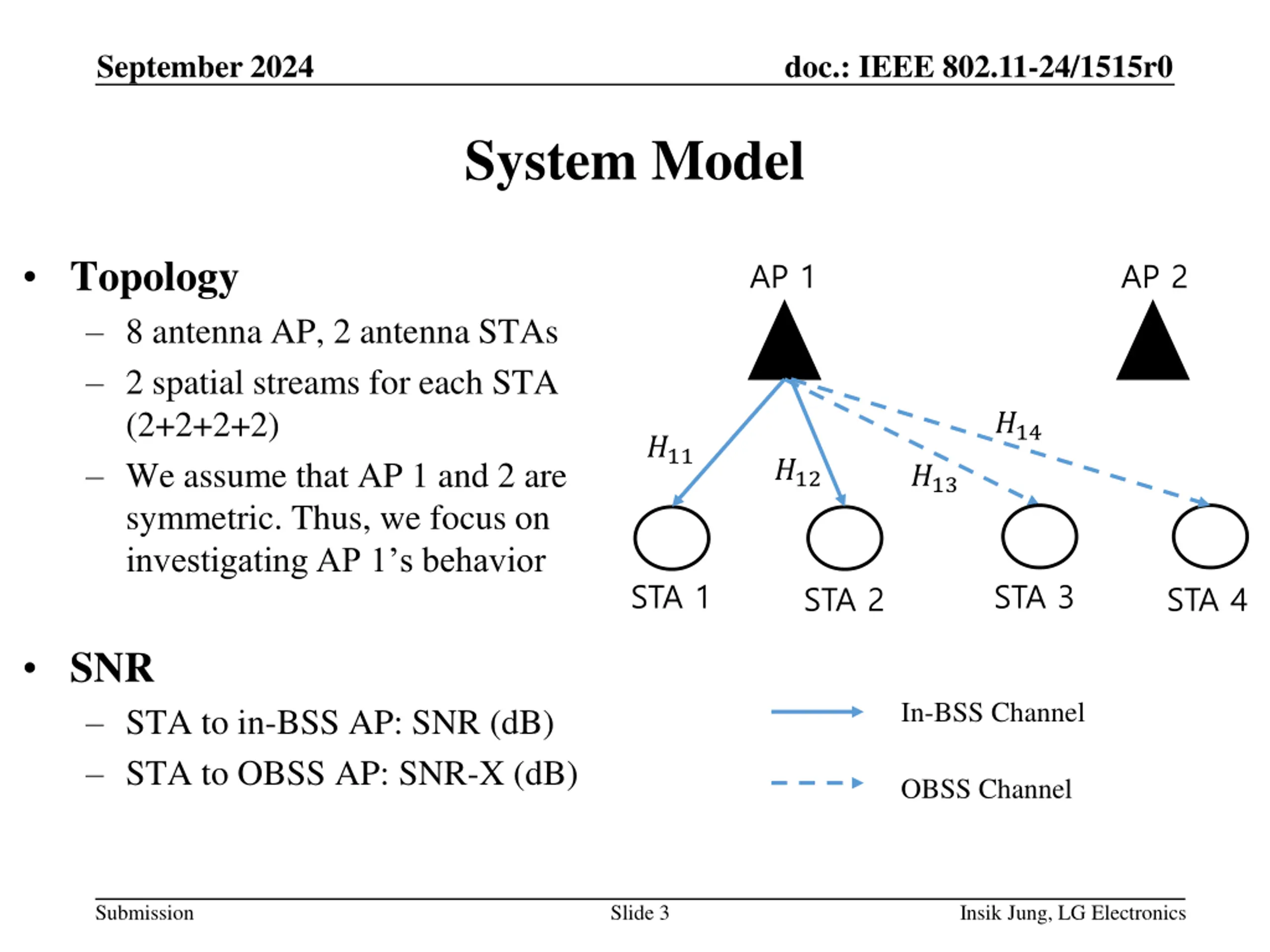 September 2024 doc.: IEEE 802.11-24/1515r0 System Model Topology 8 antenna AP, 2 antenna STAs 2 spatial streams for each STA (2+2+2+2) We assume that AP 1 and 2 are symmetric. Thus, we focus on investigating AP 1 s behavior AP 1 AP 2 ?14 ?11 ?12 ?13 STA 1 STA 3 STA 2 STA 4 SNR STA to in-BSS AP: SNR (dB) STA to OBSS AP: SNR-X (dB) In-BSS Channel OBSS Channel Submission Slide 3 Insik Jung, LG Electronics