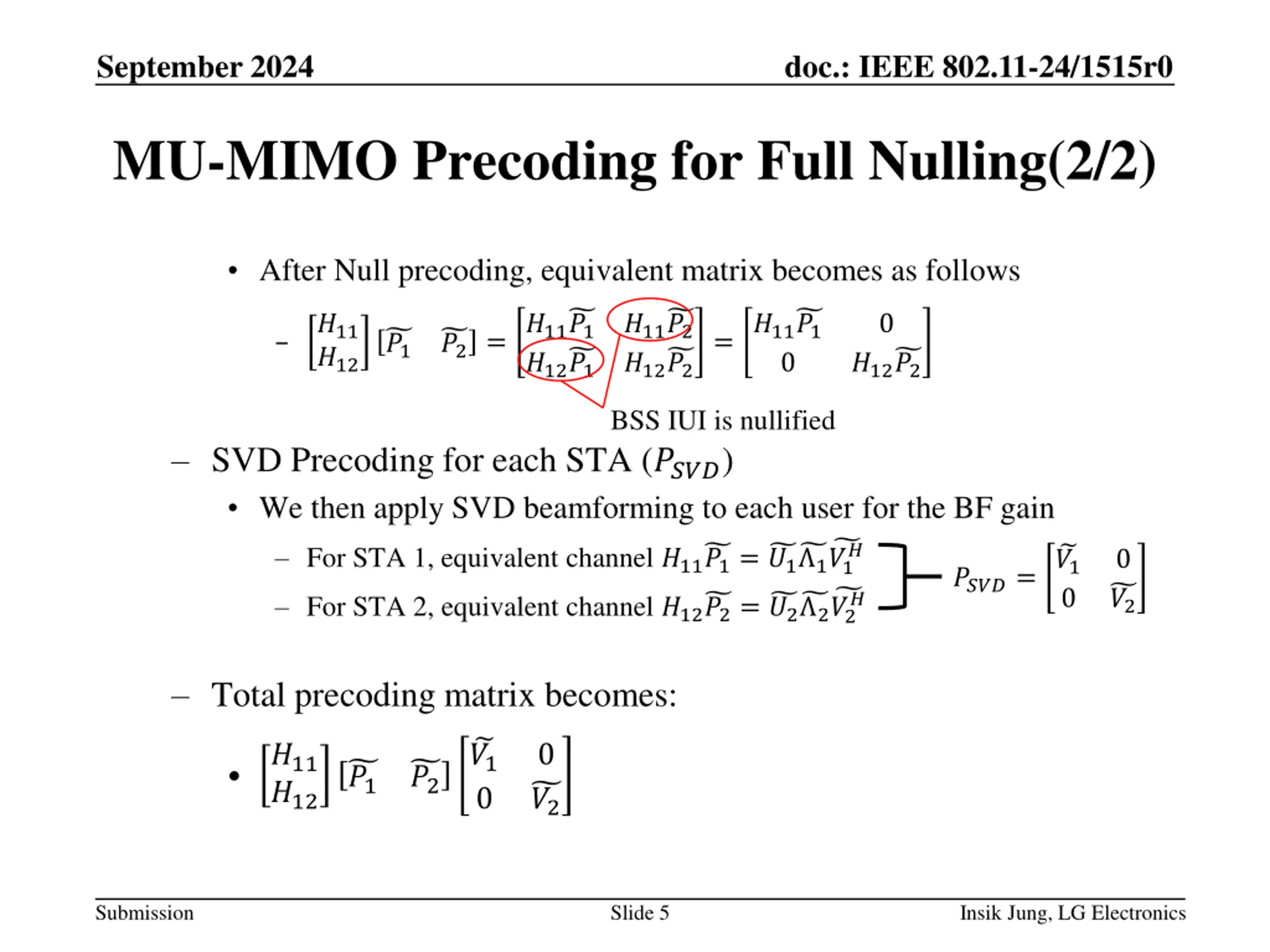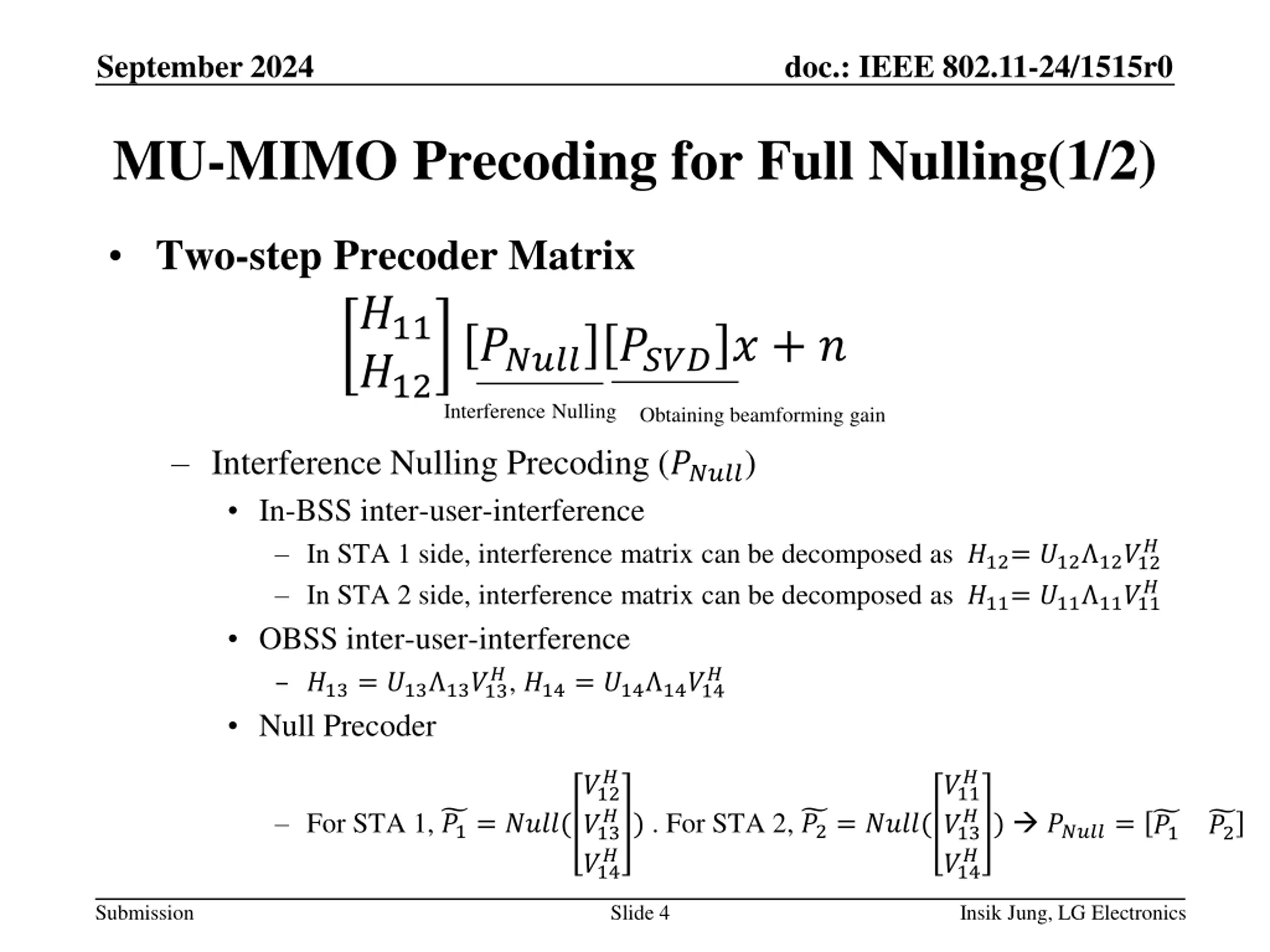 September 2024 doc.: IEEE 802.11-24/1515r0 MU-MIMO Precoding for Full Nulling(1/2) Two-step Precoder Matrix ?11 ?12 ????? ????? + ? Interference Nulling Obtaining beamforming gain Interference Nulling Precoding (?????) In-BSS inter-user-interference In STA 1 side, interference matrix can be decomposed as ?12= ?12 12?12 In STA 2 side, interference matrix can be decomposed as ?11= ?11 11?11 OBSS inter-user-interference ?13= ?13 13?13 Null Precoder ? ? ?, ?14= ?14 14?14 ? ? ? ?12 ?13 ?14 ?11 ?13 ?14 For STA 1, ) . For STA 2, ? ? ) ?????= ?2 ?1= ????( ?2= ????( ?1 ? ? Submission Slide 4 Insik Jung, LG Electronics