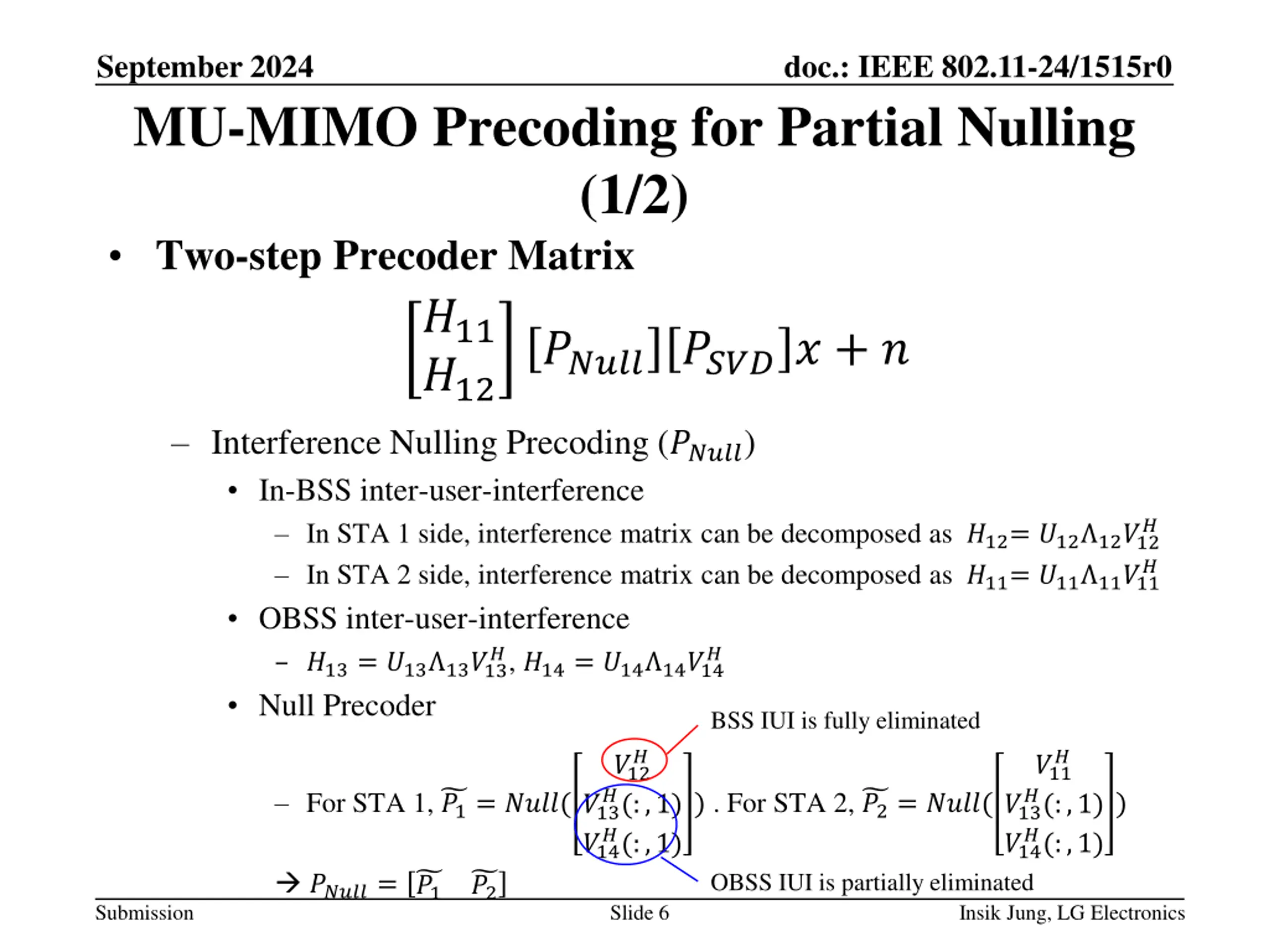 September 2024 doc.: IEEE 802.11-24/1515r0 MU-MIMO Precoding for Full Nulling(2/2) After Null precoding, equivalent matrix becomes as follows ?11 ?12 ?11 ?12 ?11 0 ?11 ?12 ?1 ?1 ?2 ?2 ?1 0 ?1 ?2= = ?12 ?2 BSS IUI is nullified SVD Precoding for each STA (????) We then apply SVD beamforming to each user for the BF gain 1 ?1 2 ?1 ?2 For STA 1, equivalent channel ?11 For STA 2, equivalent channel ?12 ?1= ?2= ? ?1 0 0 ?2 ????= ? ?2 Total precoding matrix becomes: ?1 0 0 ?2 ?11 ?12 ?1 ?2 Submission Slide 5 Insik Jung, LG Electronics