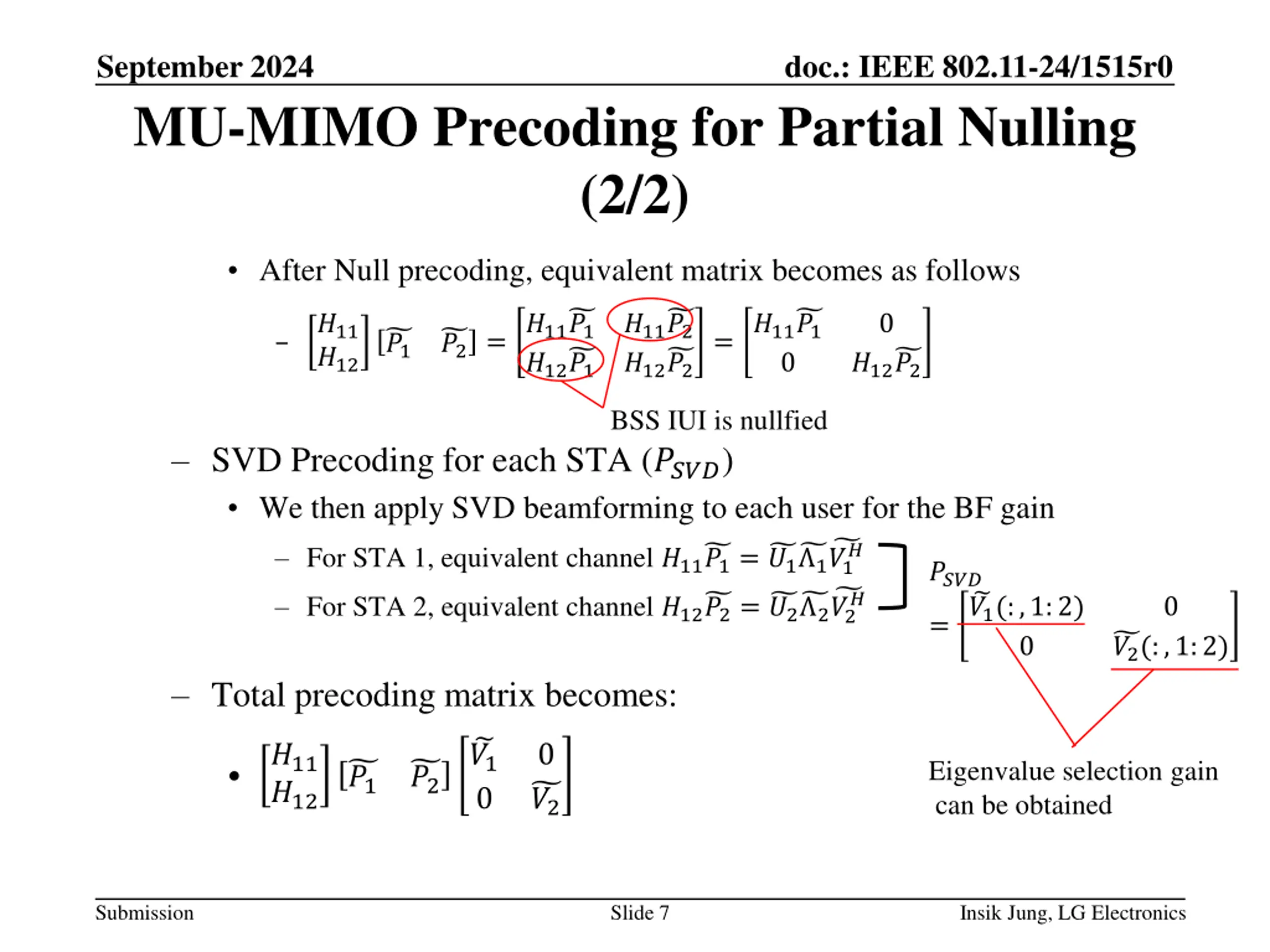 September 2024 doc.: IEEE 802.11-24/1515r0 MU-MIMO Precoding for Partial Nulling (2/2) After Null precoding, equivalent matrix becomes as follows ?11 ?12 ?11 ?12 ?11 0 ?11 ?12 ?1 ?1 ?2 ?2 ?1 0 ?1 ?2= = ?12 ?2 BSS IUI is nullfied SVD Precoding for each STA (????) We then apply SVD beamforming to each user for the BF gain 1 ?1 2 ?1 ?2 For STA 1, equivalent channel ?11 For STA 2, equivalent channel ?12 ?1= ?2= ? ???? ?1(:,1:2) 0 ? 0 ?2 = ?2(:,1:2) Total precoding matrix becomes: ?1 0 0 ?2 ?11 ?12 Eigenvalue selection gain can be obtained ?1 ?2 Submission Slide 7 Insik Jung, LG Electronics