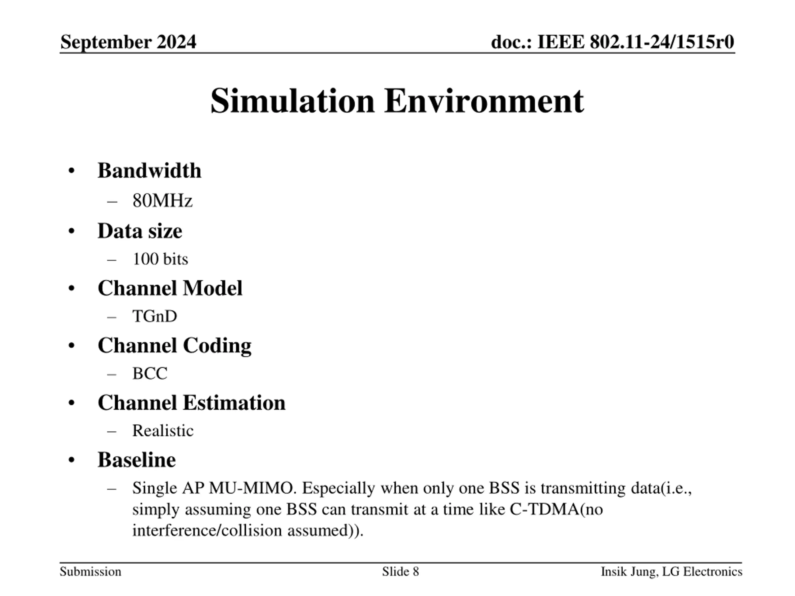 September 2024 doc.: IEEE 802.11-24/1515r0 Simulation Environment Bandwidth 80MHz Data size 100 bits Channel Model TGnD Channel Coding BCC Channel Estimation Realistic Baseline Single AP MU-MIMO. Especially when only one BSS is transmitting data(i.e., simply assuming one BSS can transmit at a time like C-TDMA(no interference/collision assumed)). Submission Slide 8 Insik Jung, LG Electronics