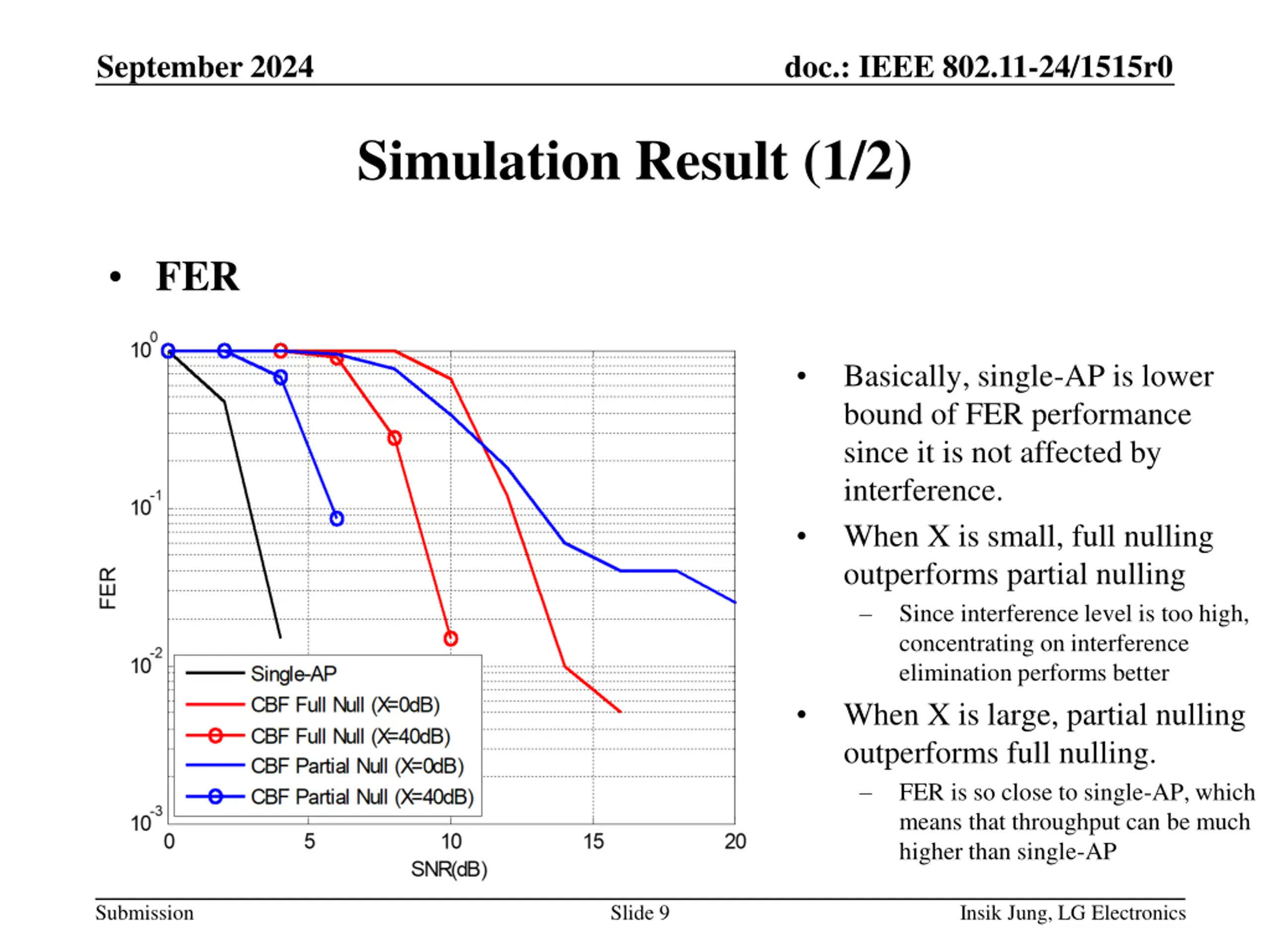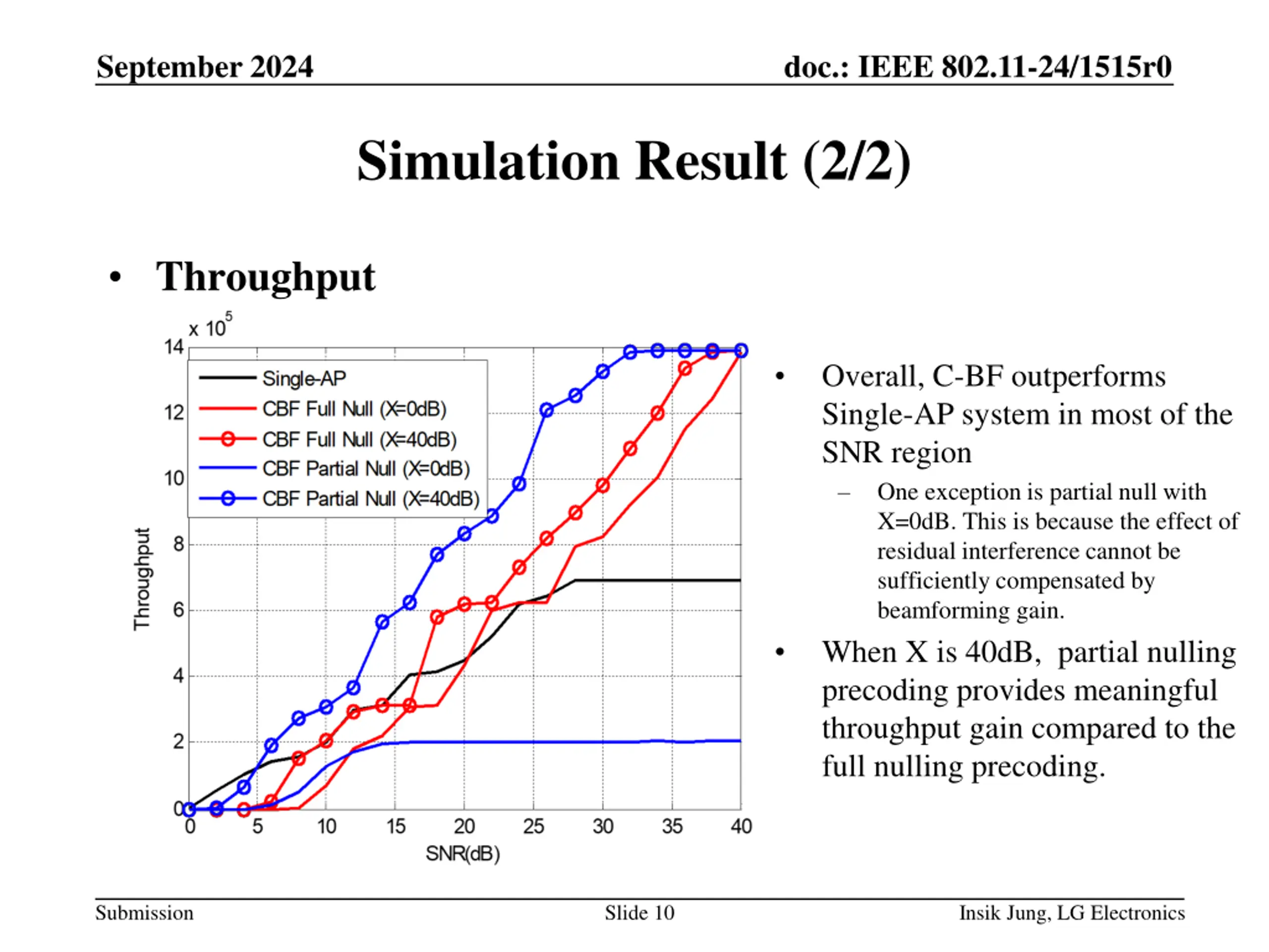 September 2024 doc.: IEEE 802.11-24/1515r0 Simulation Result (1/2) FER Basically, single-AP is lower bound of FER performance since it is not affected by interference. When X is small, full nulling outperforms partial nulling Since interference level is too high, concentrating on interference elimination performs better When X is large, partial nulling outperforms full nulling. FER is so close to single-AP, which means that throughput can be much higher than single-AP Submission Slide 9 Insik Jung, LG Electronics