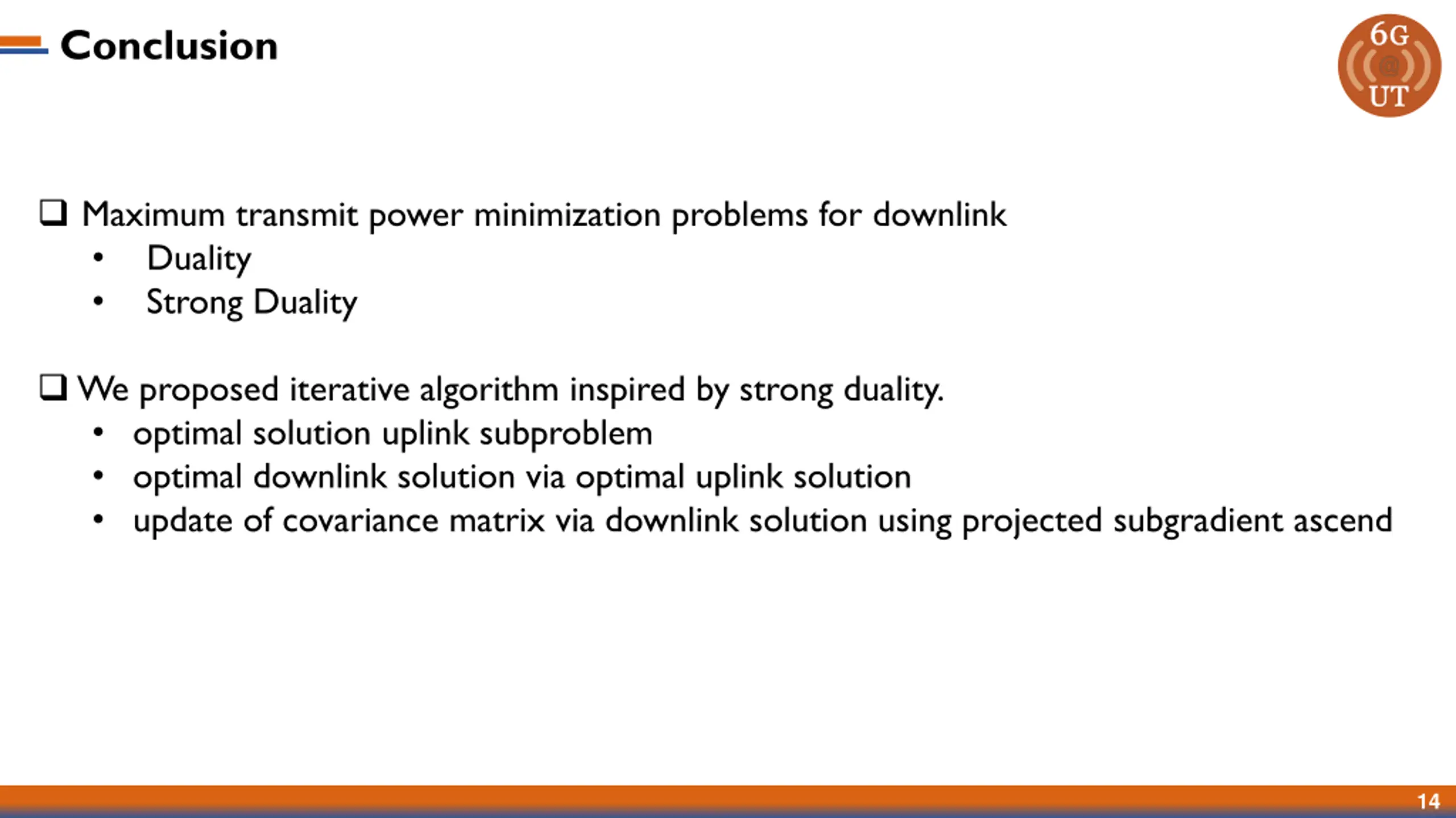 Conclusion Maximum transmit power minimization problems for downlink Duality Strong Duality We proposed iterative algorithm inspired by strong duality. optimal solution uplink subproblem optimal downlink solution via optimal uplink solution update of covariance matrix via downlink solution using projected subgradient ascend 14