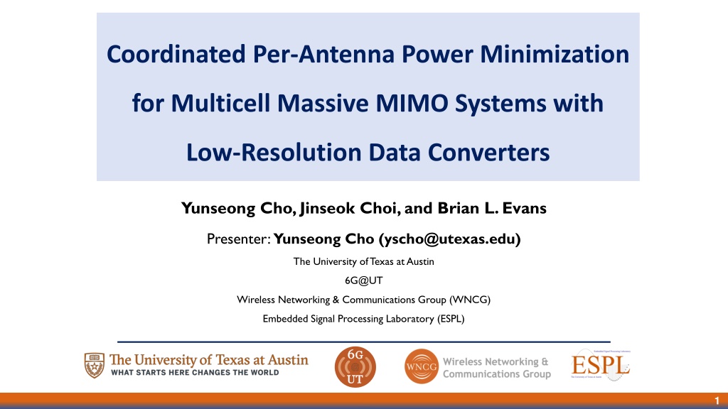 Coordinated Per-Antenna Power Minimization for Multicell Massive MIMO Systems with Low-Resolution Data Converters Yunseong Cho, Jinseok Choi, and Brian L. Evans Presenter: Yunseong Cho (yscho@utexas.edu) The University of Texas at Austin 6G@UT Wireless Networking & Communications Group (WNCG) Embedded Signal Processing Laboratory (ESPL) 1