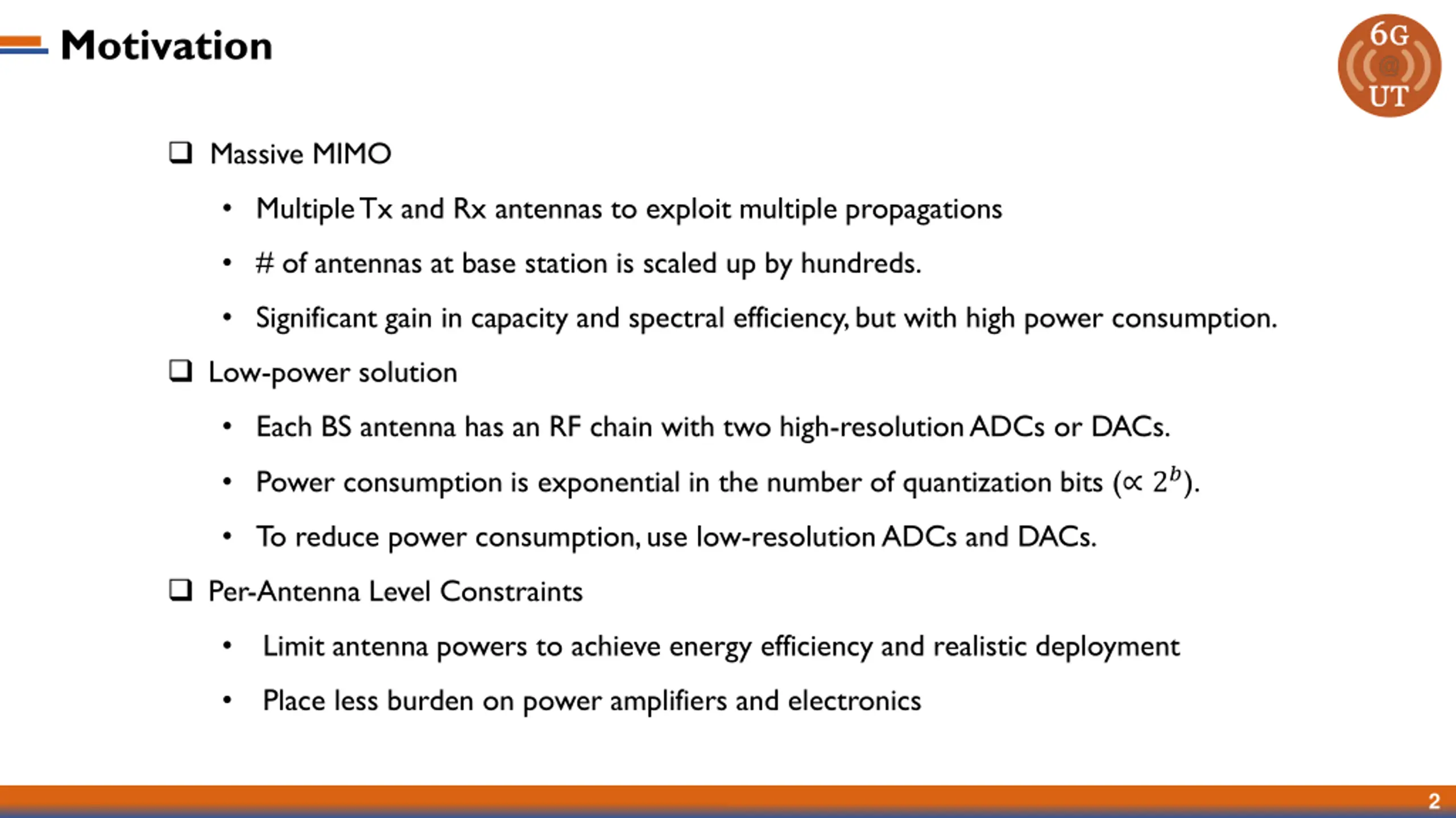 Motivation Massive MIMO Multiple Tx and Rx antennas to exploit multiple propagations # of antennas at base station is scaled up by hundreds. Significant gain in capacity and spectral efficiency, but with high power consumption. Low-power solution Each BS antenna has an RF chain with two high-resolution ADCs or DACs. Power consumption is exponential in the number of quantization bits ( 2?). To reduce power consumption, use low-resolution ADCs and DACs. Per-Antenna Level Constraints Limit antenna powers to achieve energy efficiency and realistic deployment Place less burden on power amplifiers and electronics 2