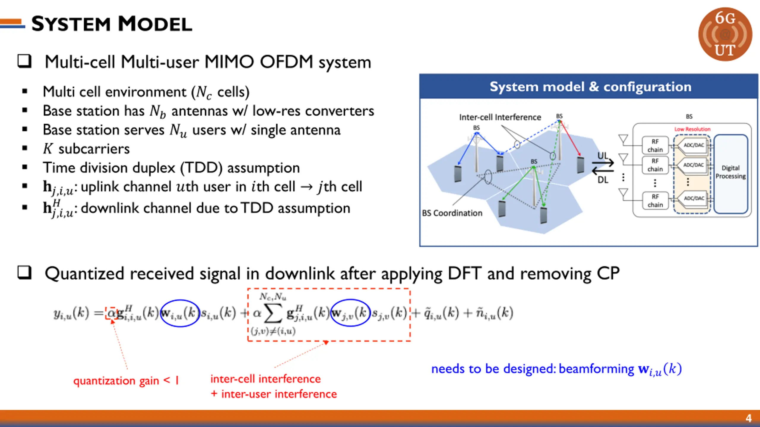 Problem Statement Goal: Minimize maximum transmit power of quantized DL OFDM with SQINR target Impairments: Quantization noise from low-resolution ADCs and DACs. Thermal noise, intra-cell, and inter-cell interference. Wideband OFDM modulation Solution: Optimal DL beamforming (primal) via optimal UL solution (dual) Use strong duality between our DL and UL. Optimal transmit power for UL with unknown noise covariance. Obtain optimal DL beamforming as function of optimal UL solution. Update noise covariance via projected subgradient ascent algorithm. 3