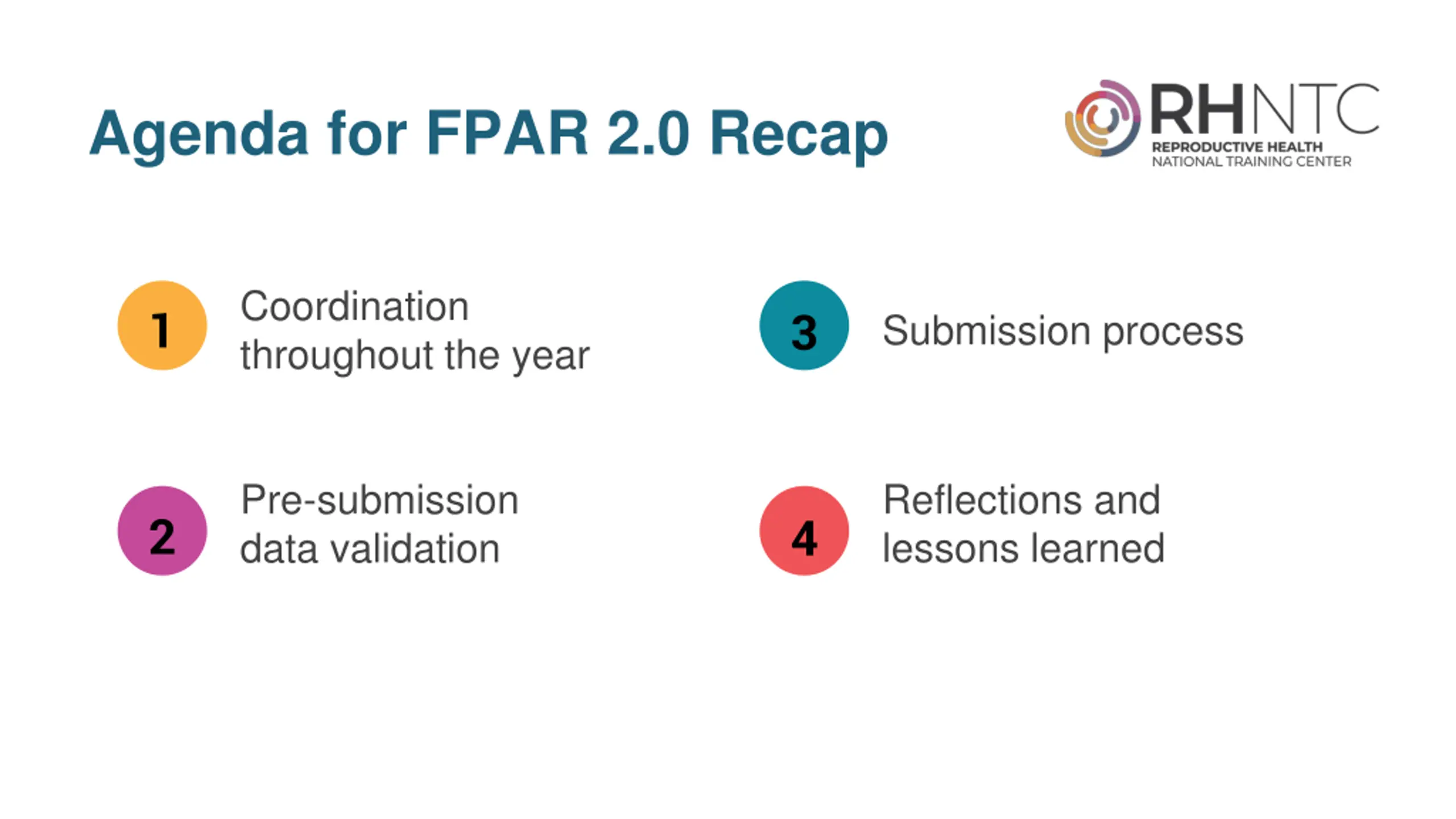 Agenda for FPAR 2.0 Recap Coordination throughout the year 1 3 Submission process Reflections and lessons learned Pre-submission data validation 2 4