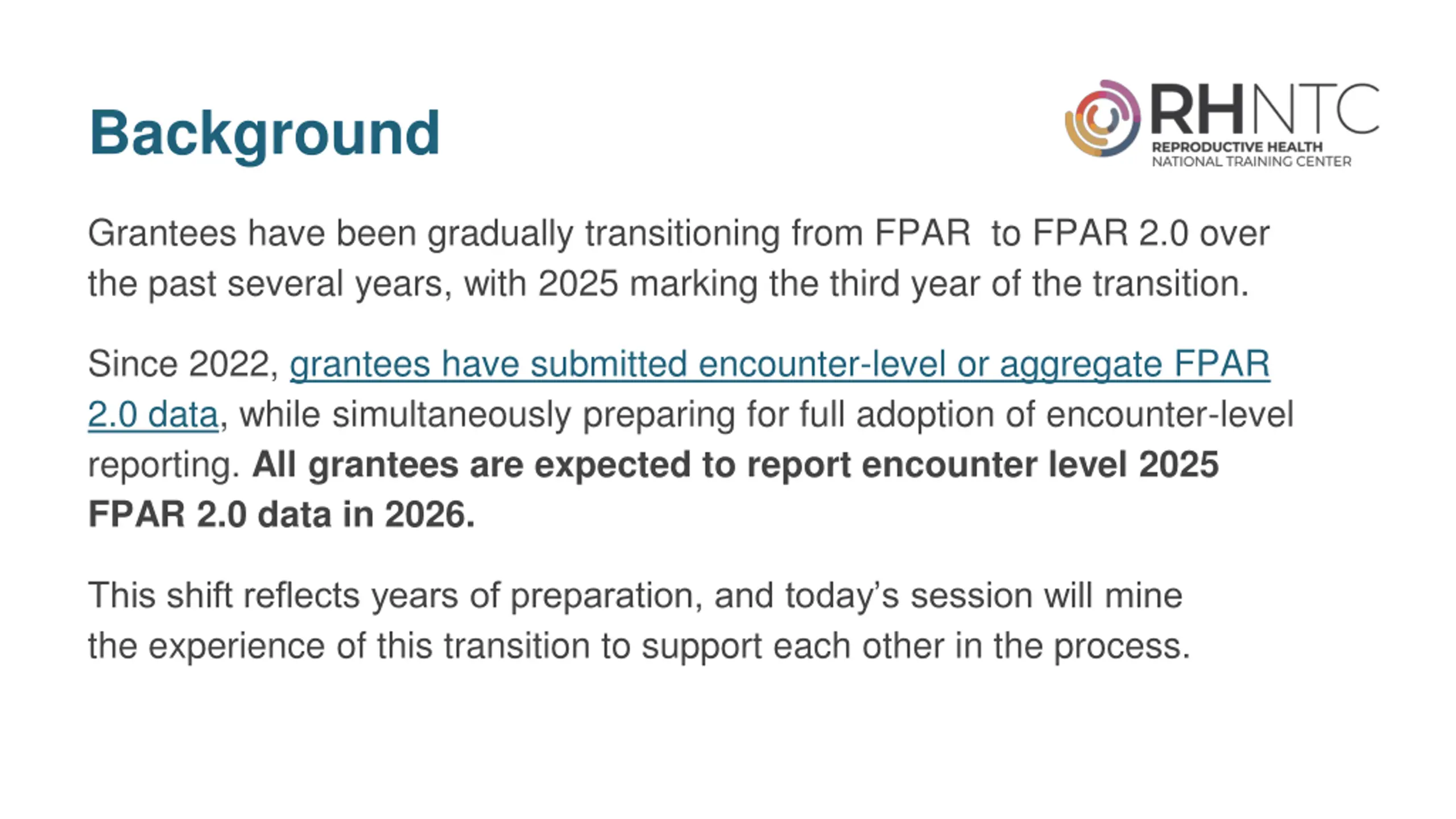Background Grantees have been gradually transitioning from FPAR to FPAR 2.0 over the past several years, with 2025 marking the third year of the transition. Since 2022, grantees have submitted encounter-level or aggregate FPAR 2.0 data, while simultaneously preparing for full adoption of encounter-level reporting. All grantees are expected to report encounter level 2025 FPAR 2.0 data in 2026. This shift reflects years of preparation, and today s session will mine the experience of this transition to support each other in the process.