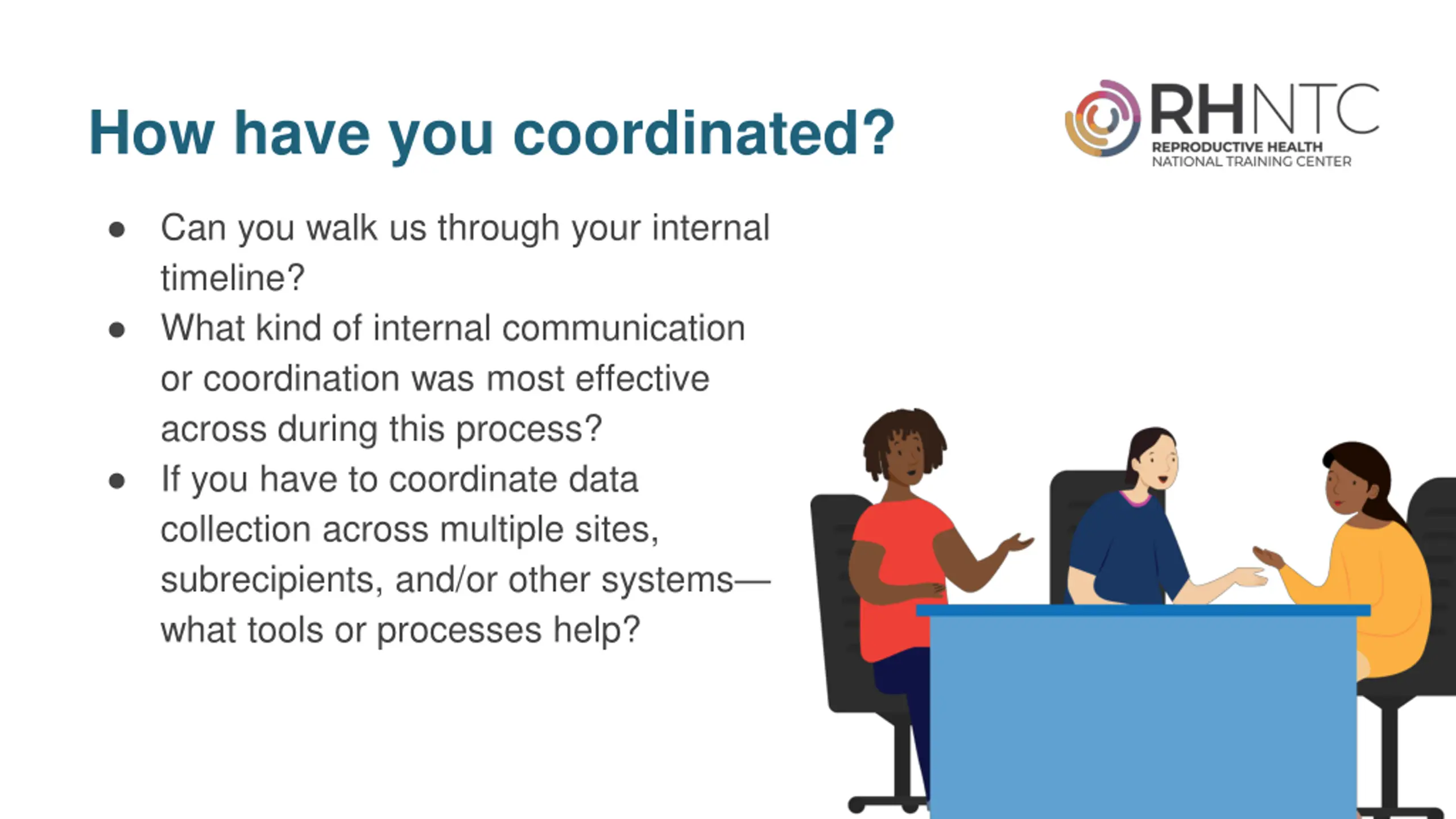 How have you coordinated? Can you walk us through your internal timeline? What kind of internal communication or coordination was most effective across during this process? If you have to coordinate data collection across multiple sites, subrecipients, and/or other systems what tools or processes help?