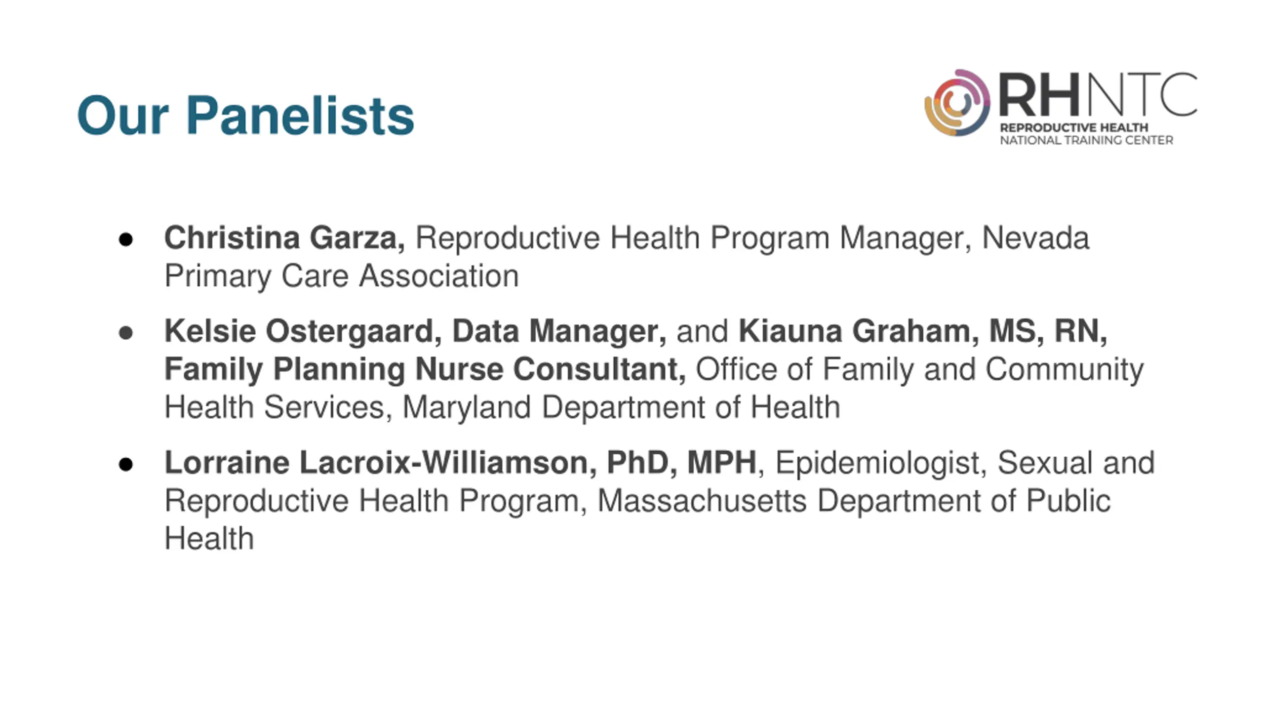 Our Panelists Christina Garza, Reproductive Health Program Manager, Nevada Primary Care Association Kelsie Ostergaard, Data Manager, and Kiauna Graham, MS, RN, Family Planning Nurse Consultant, Office of Family and Community Health Services, Maryland Department of Health Lorraine Lacroix-Williamson, PhD, MPH, Epidemiologist, Sexual and Reproductive Health Program, Massachusetts Department of Public Health