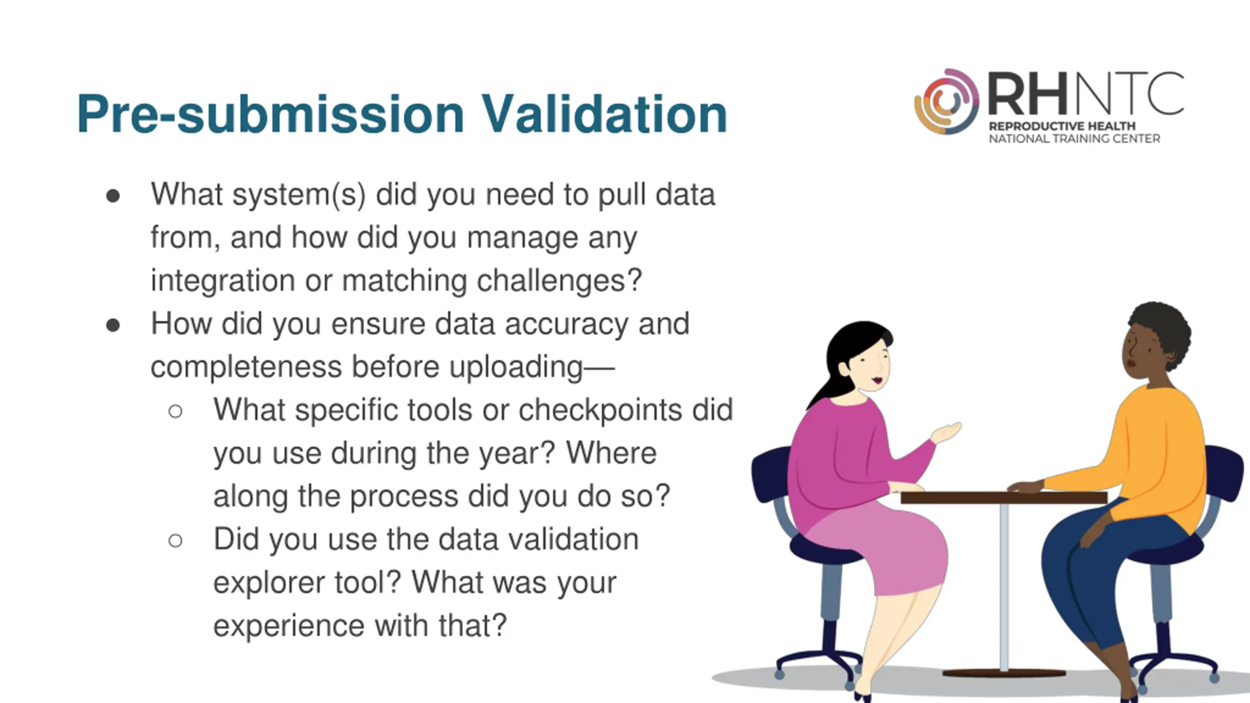 Pre-submission Validation (cont.) What system(s) did you need to pull data from, and how did you manage any integration or matching challenges? How did you ensure data accuracy and completeness before uploading What specific tools or checkpoints did you use during the year? Where along the process did you do so? Did you use the data validation explorer tool? What was your experience with that?
