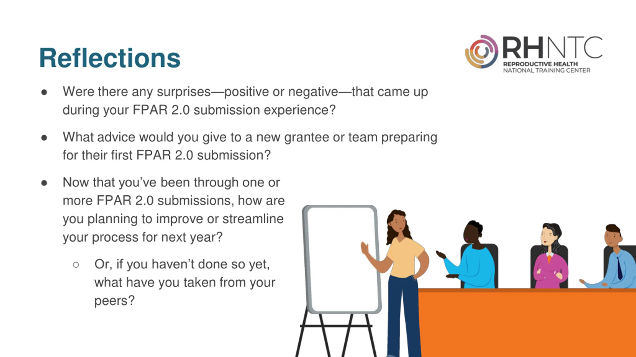 Reflections (cont.) Were there any surprises positive or negative that came up during your FPAR 2.0 submission experience? What advice would you give to a new grantee or team preparing for their first FPAR 2.0 submission? Now that you ve been through one or more FPAR 2.0 submissions, how are you planning to improve or streamline your process for next year? Or, if you haven t done so yet, what have you taken from your peers?