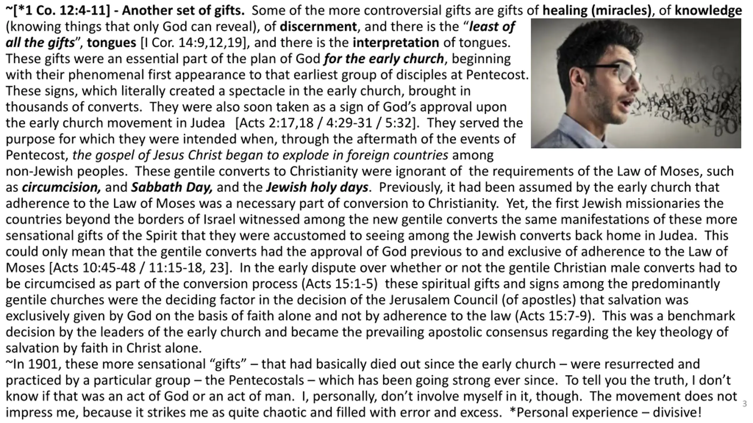 ~[*1 Co. 12:4-11] - Another set of gifts. Some of the more controversial gifts are gifts of healing (miracles), of knowledge (knowing things that only God can reveal), of discernment, and there is the least of all the gifts , tongues [I Cor. 14:9,12,19], and there is the interpretation of tongues. These gifts were an essential part of the plan of God for the early church, beginning with their phenomenal first appearance to that earliest group of disciples at Pentecost. These signs, which literally created a spectacle in the early church, brought in thousands of converts. They were also soon taken as a sign of God s approval upon the early church movement in Judea [Acts 2:17,18 / 4:29-31 / 5:32]. They served the purpose for which they were intended when, through the aftermath of the events of Pentecost, the gospel of Jesus Christ began to explode in foreign countries among non-Jewish peoples. These gentile converts to Christianity were ignorant of the requirements of the Law of Moses, such as circumcision, and Sabbath Day, and the Jewish holy days. Previously, it had been assumed by the early church that adherence to the Law of Moses was a necessary part of conversion to Christianity. Yet, the first Jewish missionaries the countries beyond the borders of Israel witnessed among the new gentile converts the same manifestations of these more sensational gifts of the Spirit that they were accustomed to seeing among the Jewish converts back home in Judea. This could only mean that the gentile converts had the approval of God previous to and exclusive of adherence to the Law of Moses [Acts 10:45-48 / 11:15-18, 23]. In the early dispute over whether or not the gentile Christian male converts had to be circumcised as part of the conversion process (Acts 15:1-5) these spiritual gifts and signs among the predominantly gentile churches were the deciding factor in the decision of the Jerusalem Council (of apostles) that salvation was exclusively given by God on the basis of faith alone and not by adherence to the law (Acts 15:7-9). This was a benchmark decision by the leaders of the early church and became the prevailing apostolic consensus regarding the key theology of salvation by faith in Christ alone. ~In 1901, these more sensational gifts that had basically died out since the early church were resurrected and practiced by a particular group the Pentecostals which has been going strong ever since. To tell you the truth, I don t know if that was an act of God or an act of man. I, personally, don t involve myself in it, though. The movement does not impress me, because it strikes me as quite chaotic and filled with error and excess. *Personal experience divisive! 3