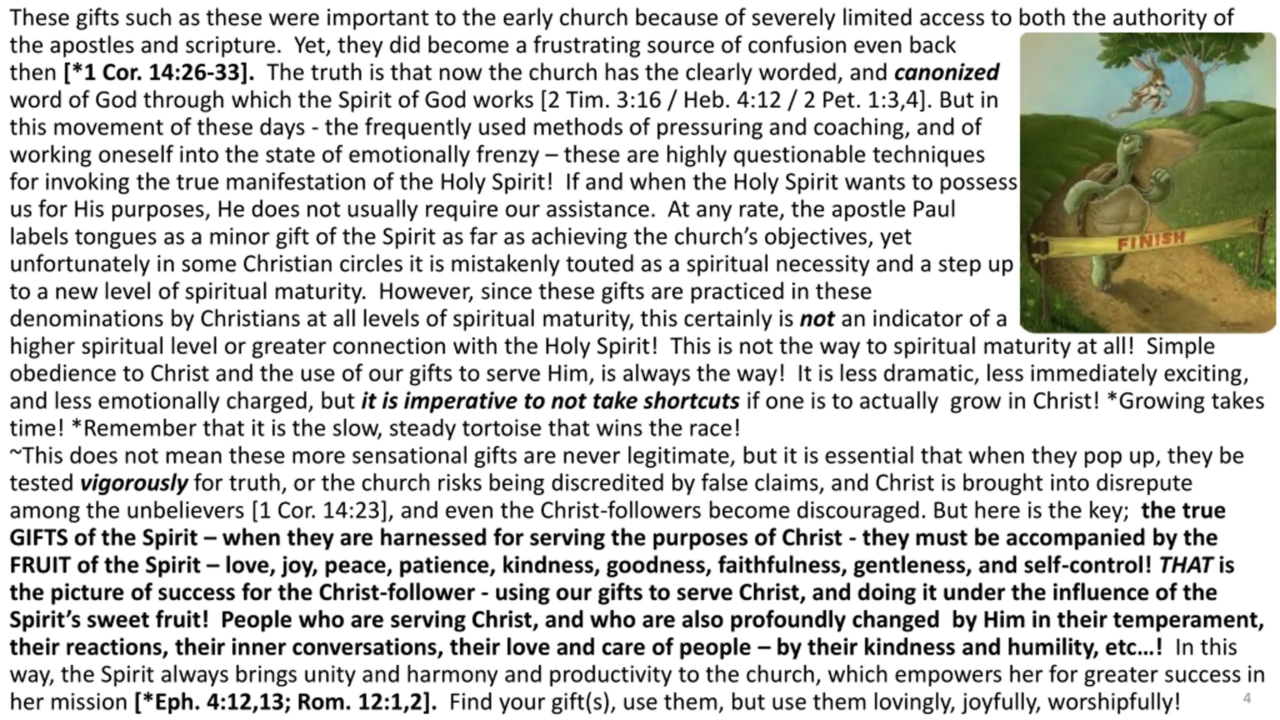 These gifts such as these were important to the early church because of severely limited access to both the authority of the apostles and scripture. Yet, they did become a frustrating source of confusion even back then [*1 Cor. 14:26-33]. The truth is that now the church has the clearly worded, and canonized word of God through which the Spirit of God works [2 Tim. 3:16 / Heb. 4:12 / 2 Pet. 1:3,4]. But in this movement of these days - the frequently used methods of pressuring and coaching, and of working oneself into the state of emotionally frenzy these are highly questionable techniques for invoking the true manifestation of the Holy Spirit! If and when the Holy Spirit wants to possess us for His purposes, He does not usually require our assistance. At any rate, the apostle Paul labels tongues as a minor gift of the Spirit as far as achieving the church s objectives, yet unfortunately in some Christian circles it is mistakenly touted as a spiritual necessity and a step up to a new level of spiritual maturity. However, since these gifts are practiced in these denominations by Christians at all levels of spiritual maturity, this certainly is not an indicator of a higher spiritual level or greater connection with the Holy Spirit! This is not the way to spiritual maturity at all! Simple obedience to Christ and the use of our gifts to serve Him, is always the way! It is less dramatic, less immediately exciting, and less emotionally charged, but it isimperative to not take shortcuts if one is to actually grow in Christ! *Growing takes time! *Remember that it is the slow, steady tortoise that wins the race! ~This does not mean these more sensational gifts are never legitimate, but it is essential that when they pop up, they be tested vigorously for truth, or the church risks being discredited by false claims, and Christ is brought into disrepute among the unbelievers [1 Cor. 14:23], and even the Christ-followers become discouraged. But here is the key; the true GIFTS of the Spirit when they are harnessed for serving the purposes of Christ - they must be accompanied by the FRUIT of the Spirit love, joy, peace, patience, kindness, goodness, faithfulness, gentleness, and self-control! THAT is the picture of success for the Christ-follower - using our gifts to serve Christ, and doing it under the influence of the Spirit s sweet fruit! People who are serving Christ, and who are also profoundly changed by Him in their temperament, their reactions, their inner conversations, their love and care of people by their kindness and humility, etc ! In this way, the Spirit always brings unity and harmony and productivity to the church, which empowers her for greater success in her mission [*Eph. 4:12,13; Rom. 12:1,2]. Find your gift(s), use them, but use them lovingly, joyfully, worshipfully! 4