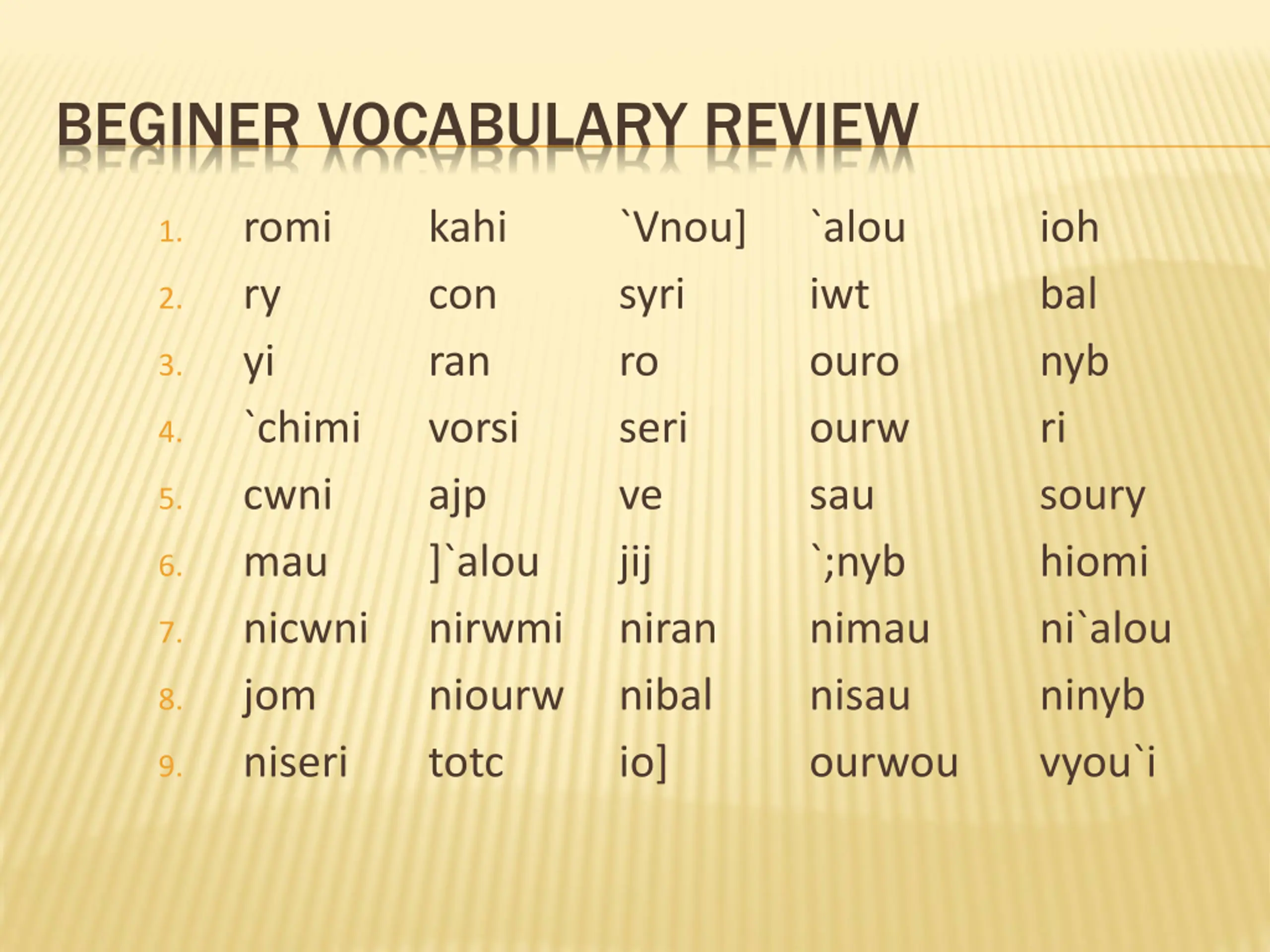 BEGINER VOCABULARY REVIEW romi ry yi `chimi cwni mau nicwni jom niseri kahi con ran vorsi ajp ]`alou nirwmi niourw nibal totc `Vnou] syri ro seri ve jij niran `alou iwt ouro ourw sau `;nyb nimau nisau ourwou ioh bal nyb ri soury hiomi ni`alou ninyb vyou`i 1. 2. 3. 4. 5. 6. 7. 8. io] 9.
