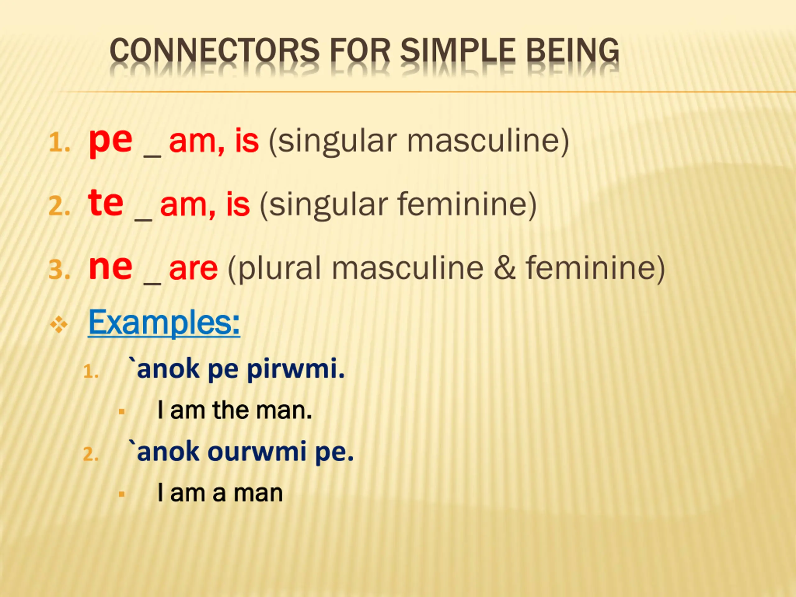 CONNECTORS FOR SIMPLE BEING 1. pe _ am, is am, is (singular masculine) 2. te _ am, is am, is (singular feminine) 3. ne_ are Examples: Examples: `anok pe pirwmi. I am the man. I am the man. `anok ourwmi pe. I am a man I am a man are (plural masculine & feminine) 1. 2.
