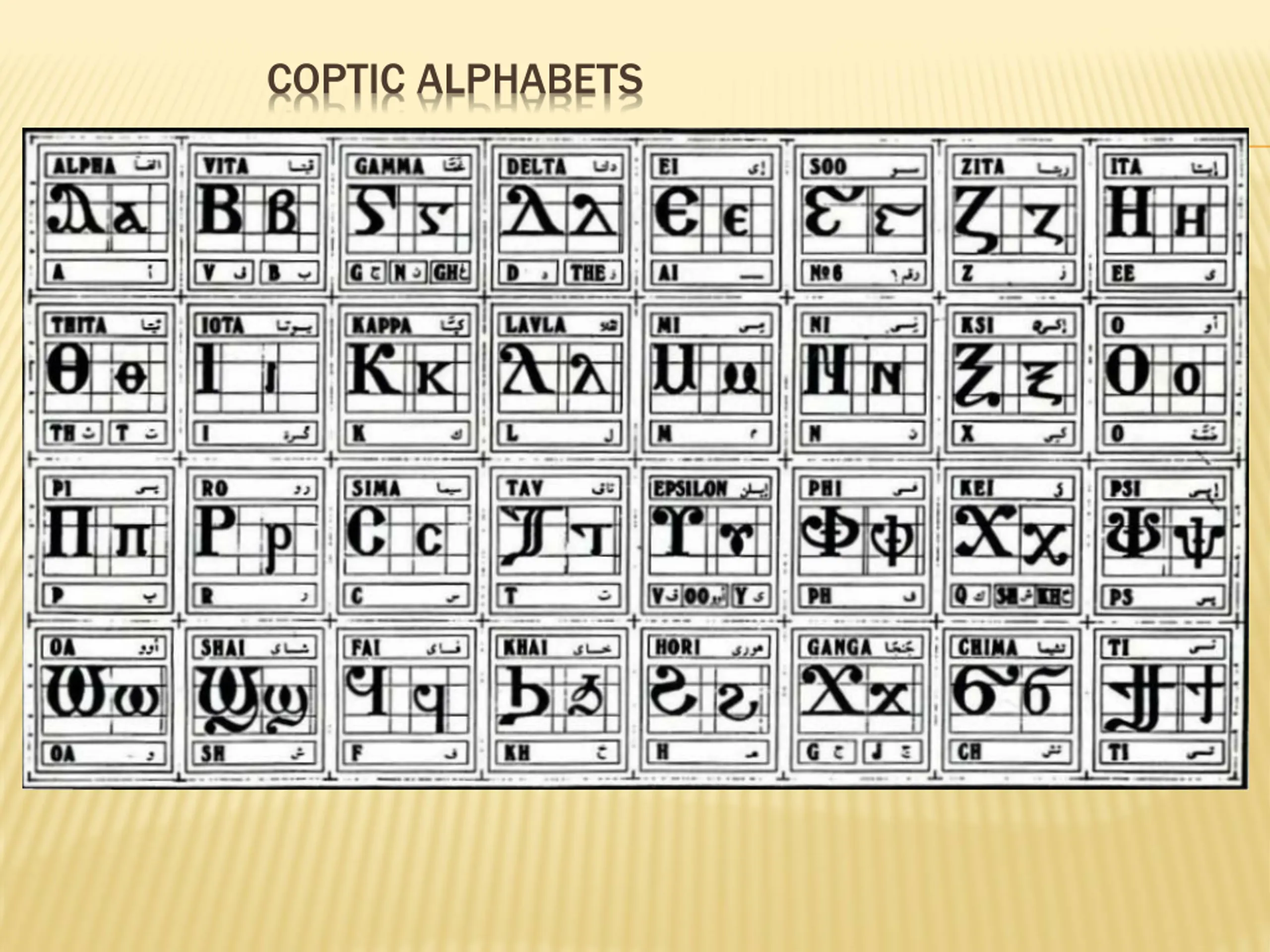 REVIEW QUESTIONS Coptic ' Name English Epsee ps d Delta d, z Martyr Marturoc 2 =b `cnau f g =c Fai f Ghamma gh, g, n 200 `cnau-se