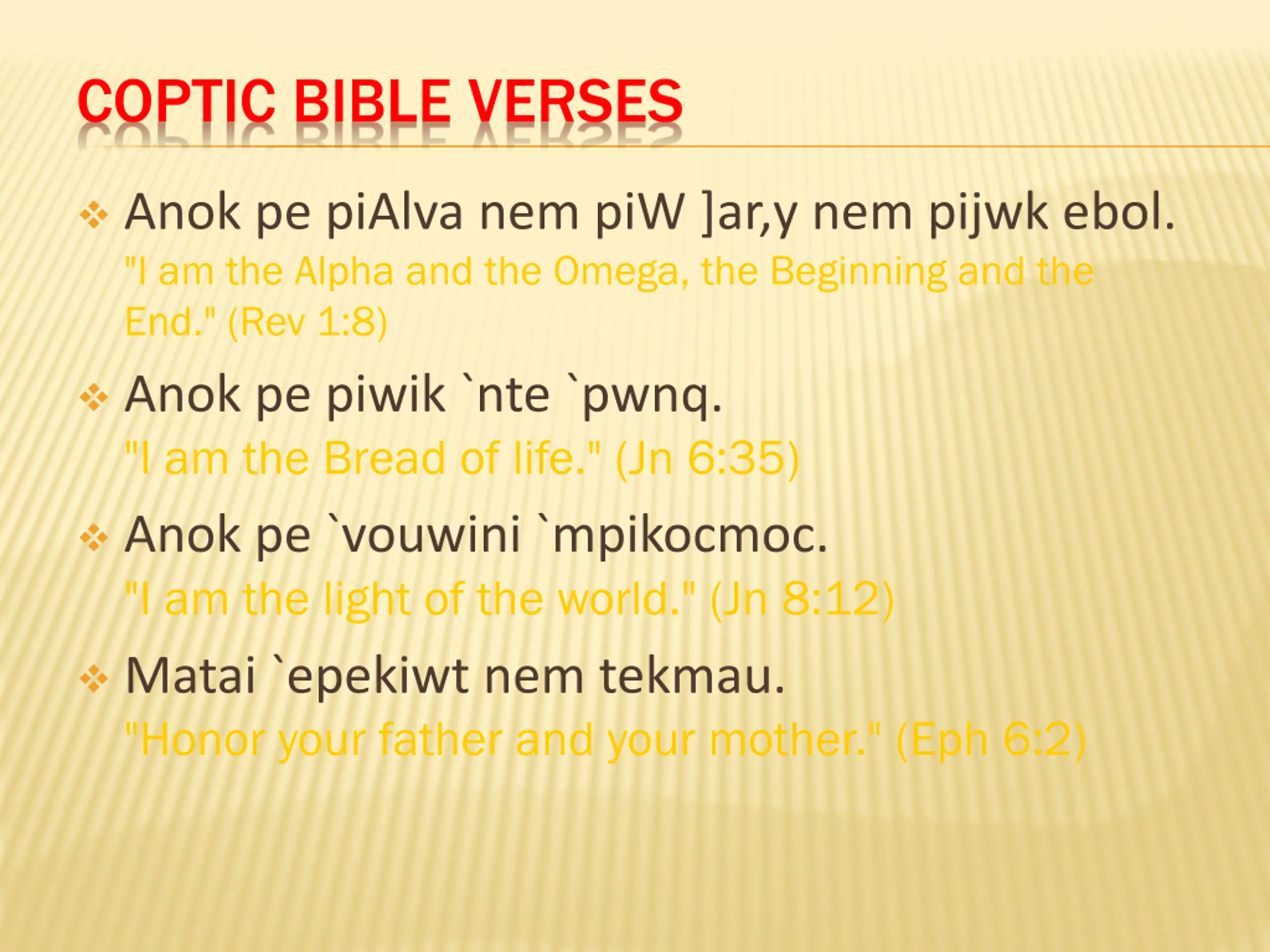 COPTIC BIBLE VERSES Anok pe piAlva nem piW ]ar,y nem pijwk ebol. "I am the Alpha and the Omega, the Beginning and the End." (Rev 1:8) Anok pe piwik `nte `pwnq. "I am the Bread of life." (Jn 6:35) Anok pe `vouwini `mpikocmoc. "I am the light of the world." (Jn 8:12) Matai `epekiwt nem tekmau. "Honor your father and your mother." (Eph 6:2)