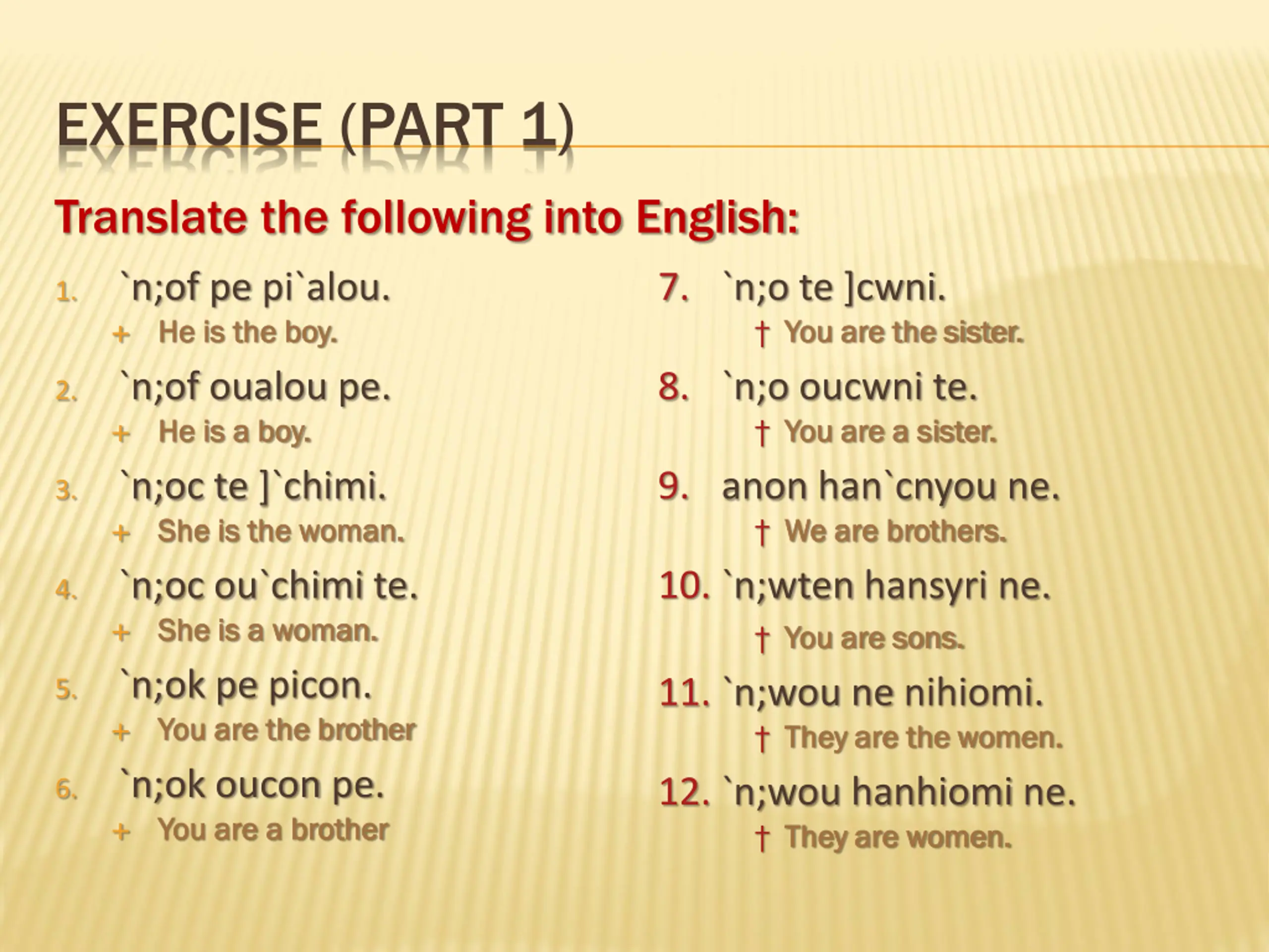 EXERCISE (PART 1) Translate the following into English: `n;of pe pi`alou. He is the boy. He is the boy. `n;of oualou pe. He is a boy. He is a boy. `n;oc te ]`chimi. She is the woman. She is the woman. `n;oc ou`chimi te. She is a woman. She is a woman. `n;ok pe picon. You are the brother You are the brother `n;ok oucon pe. You are a brother You are a brother 7. `n;o te ]cwni. You are the sister. You are the sister. 8. `n;o oucwni te. You are a sister. You are a sister. 9. anon han`cnyou ne. We are brothers. We are brothers. 10. `n;wten hansyri ne. You are sons. You are sons. 11. `n;wou ne nihiomi. They are the women. They are the women. 12. `n;wou hanhiomi ne. They are women. They are women. 1. 2. 3. 4. 5. 6.