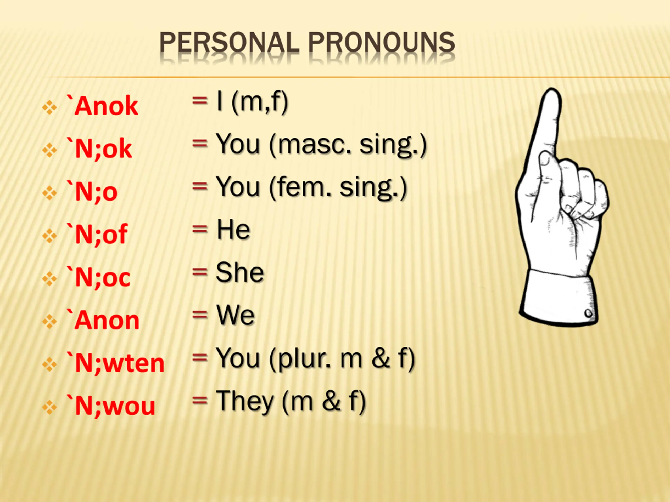 PERSONAL PRONOUNS = I (m,f) = You (masc. sing.) = You (fem. sing.) = He = She = We = You (plur. m & f) = They (m & f) `Anok `N;ok `N;o `N;of `N;oc `Anon `N;wten `N;wou