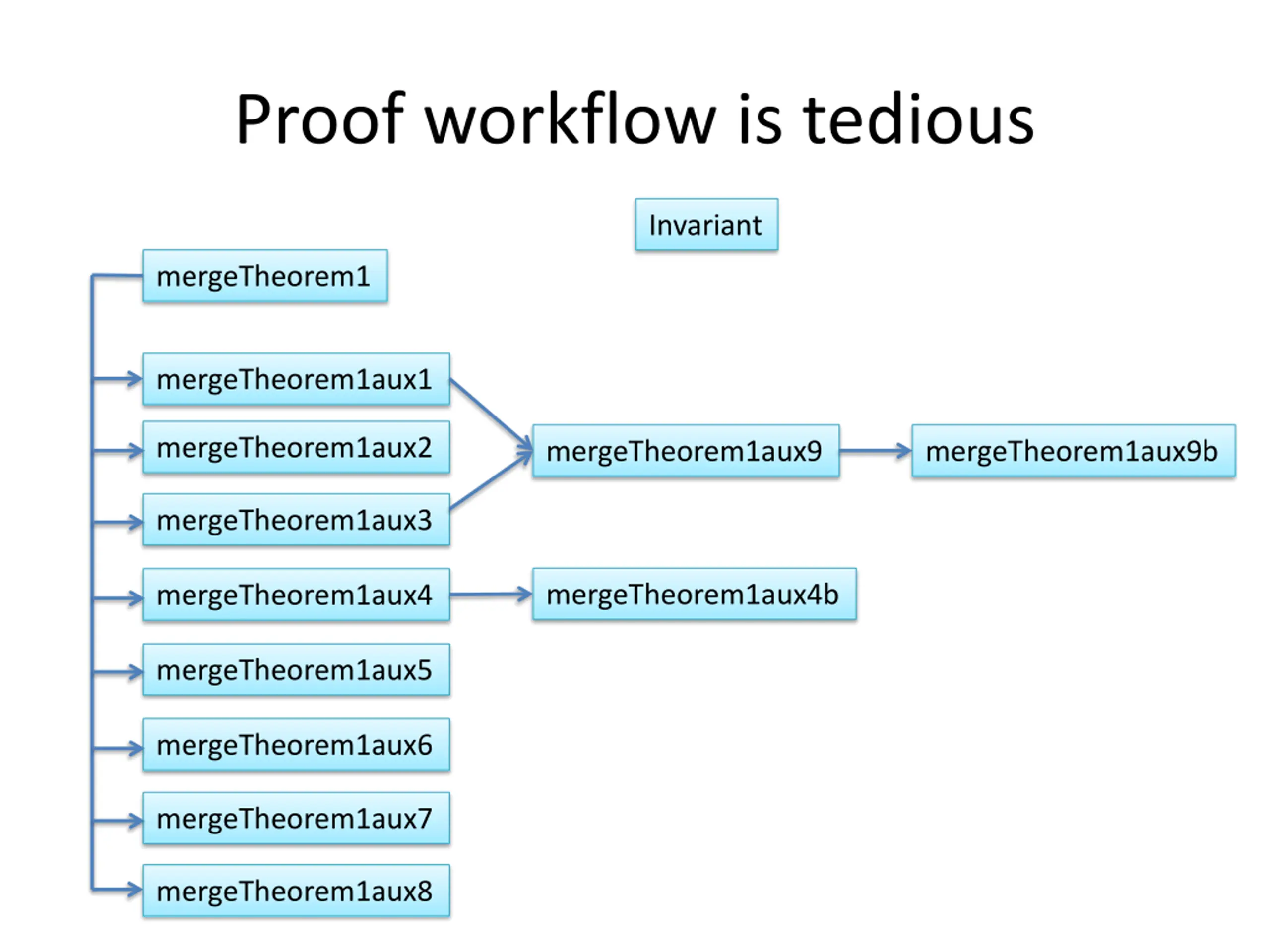 Proof workflow is tedious Invariant mergeTheorem1 mergeTheorem1aux1 mergeTheorem1aux2 mergeTheorem1aux9 mergeTheorem1aux9b mergeTheorem1aux3 mergeTheorem1aux4b mergeTheorem1aux4 mergeTheorem1aux5 mergeTheorem1aux6 mergeTheorem1aux7 mergeTheorem1aux8