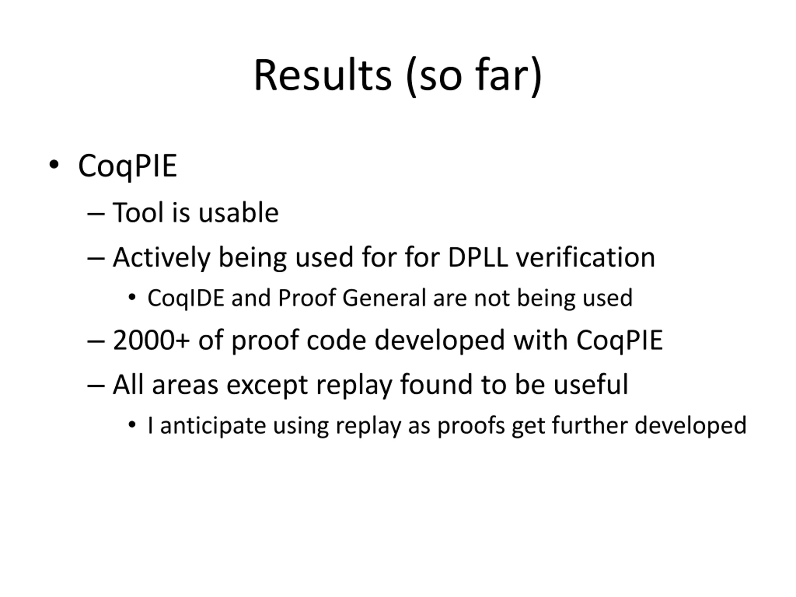 Results (so far) CoqPIE Tool is usable Actively being used for for DPLL verification CoqIDE and Proof General are not being used 2000+ of proof code developed with CoqPIE All areas except replay found to be useful I anticipate using replay as proofs get further developed