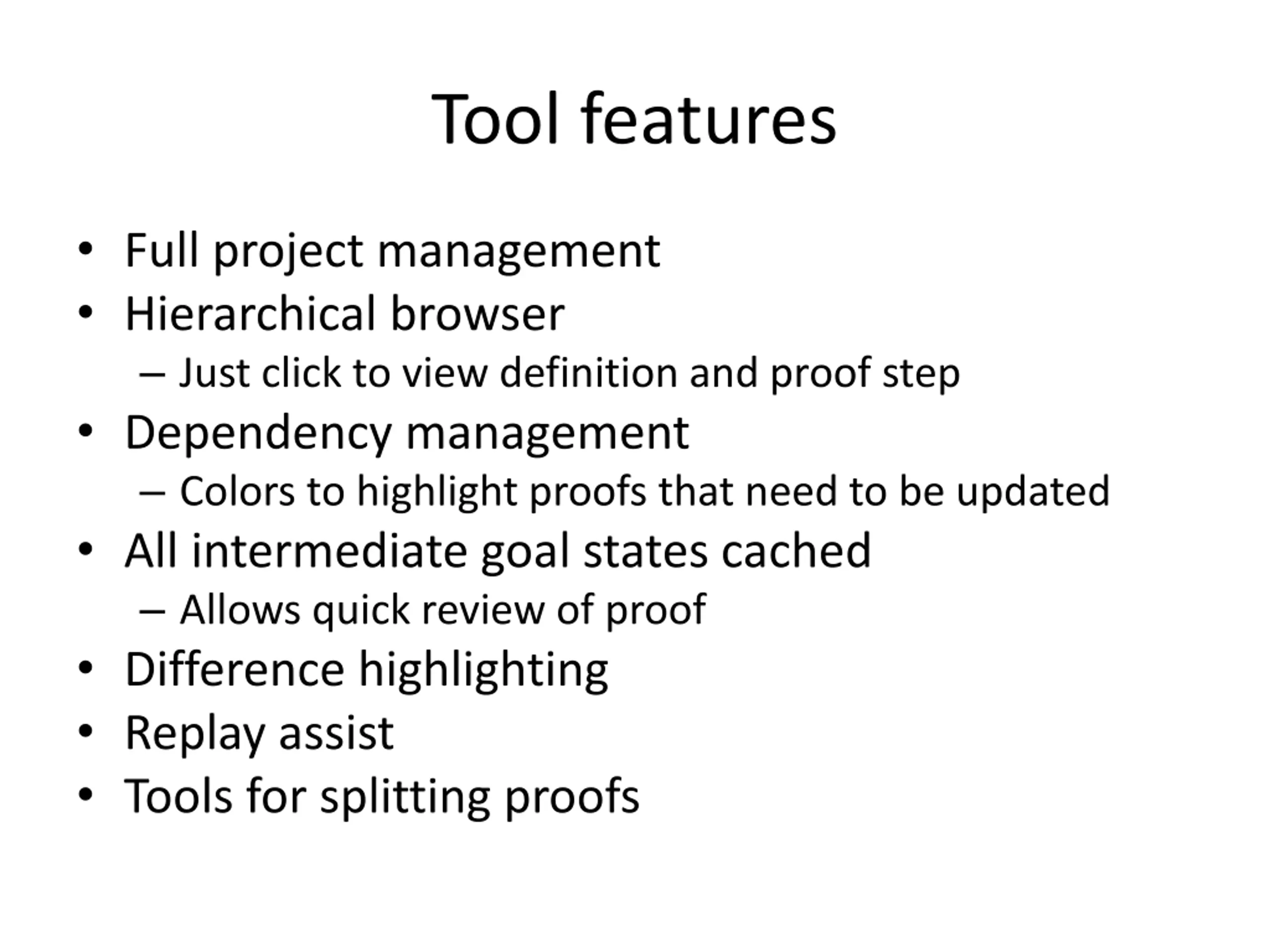 Tool features Full project management Hierarchical browser Just click to view definition and proof step Dependency management Colors to highlight proofs that need to be updated All intermediate goal states cached Allows quick review of proof Difference highlighting Replay assist Tools for splitting proofs