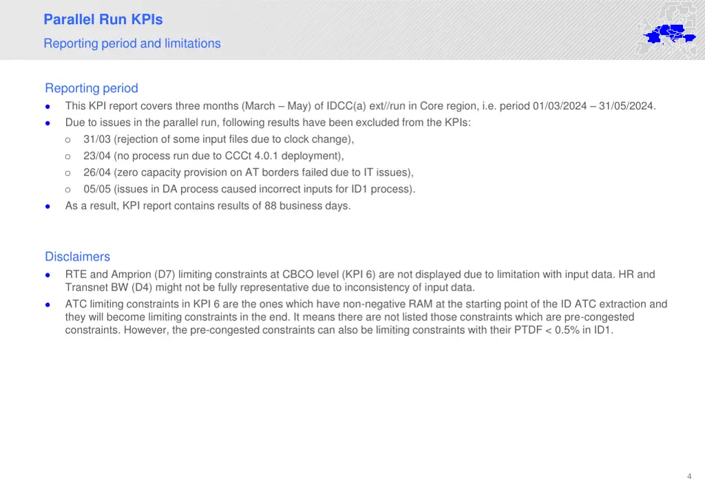 Parallel Run KPIs Reporting period and limitations Reporting period This KPI report covers three months (March May) of IDCC(a) ext//run in Core region, i.e. period 01/03/2024 31/05/2024. Due to issues in the parallel run, following results have been excluded from the KPIs: 31/03 (rejection of some input files due to clock change), 23/04 (no process run due to CCCt 4.0.1 deployment), 26/04 (zero capacity provision on AT borders failed due to IT issues), 05/05 (issues in DA process caused incorrect inputs for ID1 process). As a result, KPI report contains results of 88 business days. Disclaimers RTE and Amprion (D7) limiting constraints at CBCO level (KPI 6) are not displayed due to limitation with input data. HR and Transnet BW (D4) might not be fully representative due to inconsistency of input data. ATC limiting constraints in KPI 6 are the ones which have non-negative RAM at the starting point of the ID ATC extraction and they will become limiting constraints in the end. It means there are not listed those constraints which are pre-congested constraints. However, the pre-congested constraints can also be limiting constraints with their PTDF < 0.5% in ID1. 4