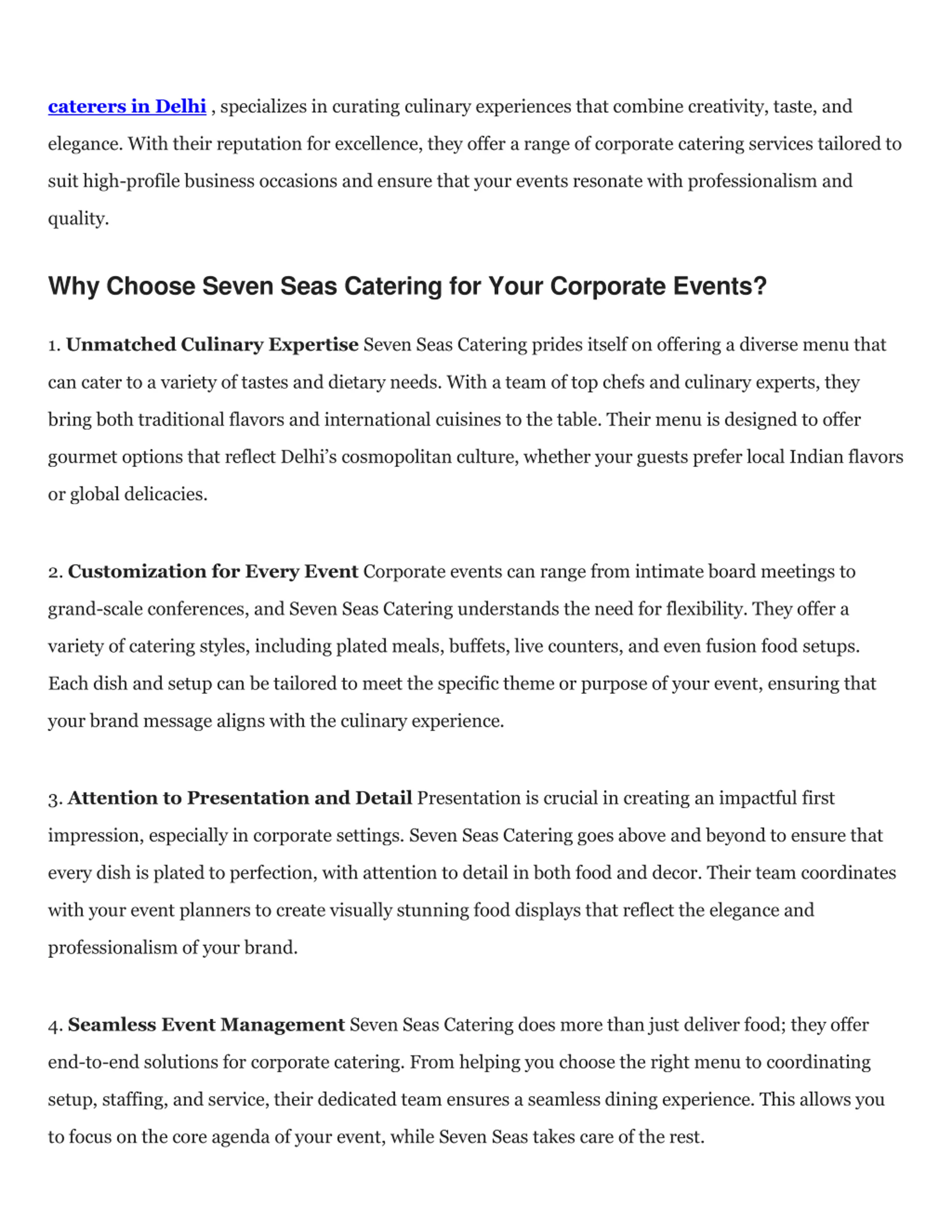 caterers in Delhi , specializes in curating culinary experiences that combine creativity, taste, and elegance. With their reputation for excellence, they offer a range of corporate catering services tailored to suit high-profile business occasions and ensure that your events resonate with professionalism and quality. Why Choose Seven Seas Catering for Your Corporate Events? 1. Unmatched Culinary Expertise Seven Seas Catering prides itself on offering a diverse menu that can cater to a variety of tastes and dietary needs. With a team of top chefs and culinary experts, they bring both traditional flavors and international cuisines to the table. Their menu is designed to offer gourmet options that reflect Delhi s cosmopolitan culture, whether your guests prefer local Indian flavors or global delicacies. 2. Customization for Every Event Corporate events can range from intimate board meetings to grand-scale conferences, and Seven Seas Catering understands the need for flexibility. They offer a variety of catering styles, including plated meals, buffets, live counters, and even fusion food setups. Each dish and setup can be tailored to meet the specific theme or purpose of your event, ensuring that your brand message aligns with the culinary experience. 3. Attention to Presentation and Detail Presentation is crucial in creating an impactful first impression, especially in corporate settings. Seven Seas Catering goes above and beyond to ensure that every dish is plated to perfection, with attention to detail in both food and decor. Their team coordinates with your event planners to create visually stunning food displays that reflect the elegance and professionalism of your brand. 4. Seamless Event Management Seven Seas Catering does more than just deliver food; they offer end-to-end solutions for corporate catering. From helping you choose the right menu to coordinating setup, staffing, and service, their dedicated team ensures a seamless dining experience. This allows you to focus on the core agenda of your event, while Seven Seas takes care of the rest.