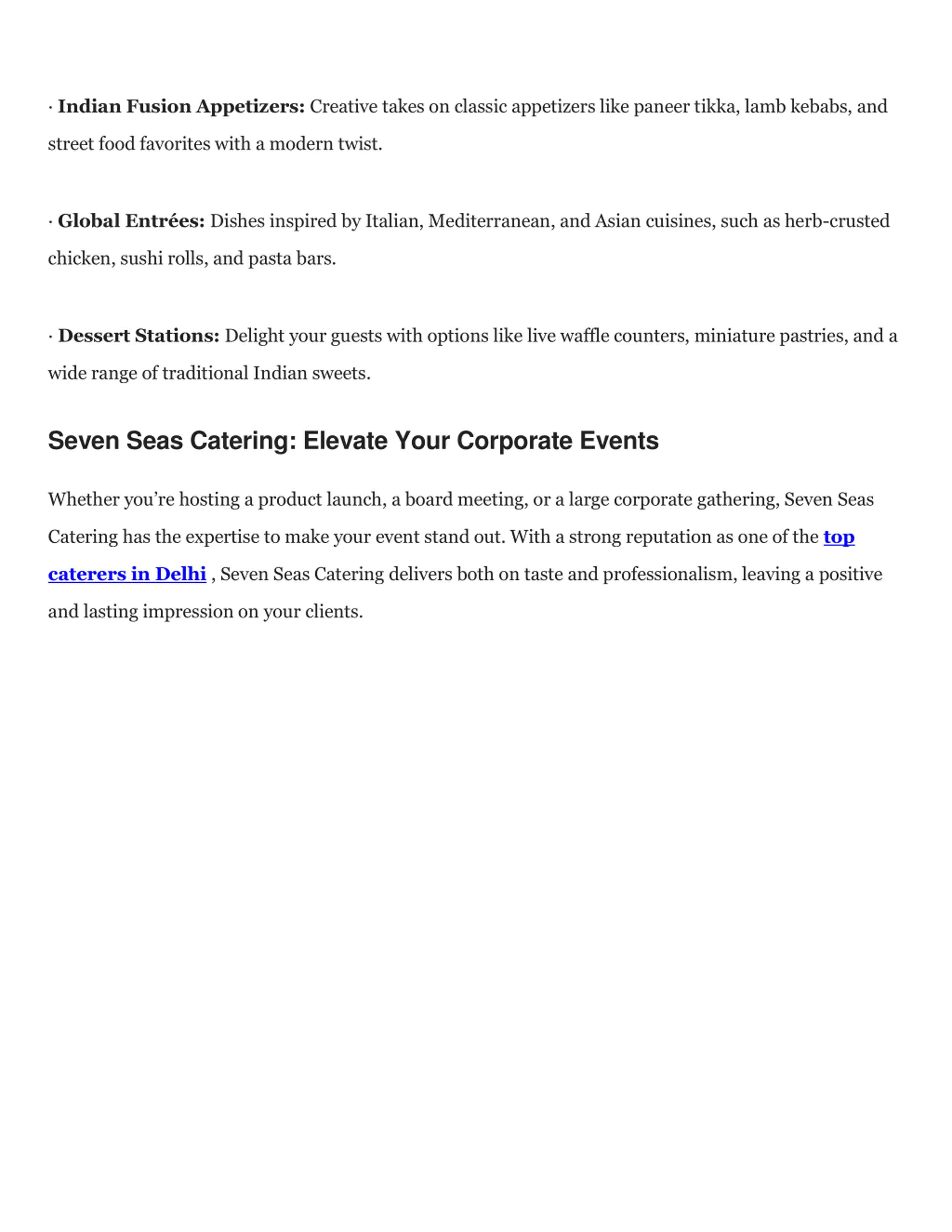 Indian Fusion Appetizers: Creative takes on classic appetizers like paneer tikka, lamb kebabs, and street food favorites with a modern twist. Global Entr es: Dishes inspired by Italian, Mediterranean, and Asian cuisines, such as herb-crusted chicken, sushi rolls, and pasta bars. Dessert Stations: Delight your guests with options like live waffle counters, miniature pastries, and a wide range of traditional Indian sweets. Seven Seas Catering: Elevate Your Corporate Events Whether you re hosting a product launch, a board meeting, or a large corporate gathering, Seven Seas Catering has the expertise to make your event stand out. With a strong reputation as one of the top caterers in Delhi , Seven Seas Catering delivers both on taste and professionalism, leaving a positive and lasting impression on your clients.