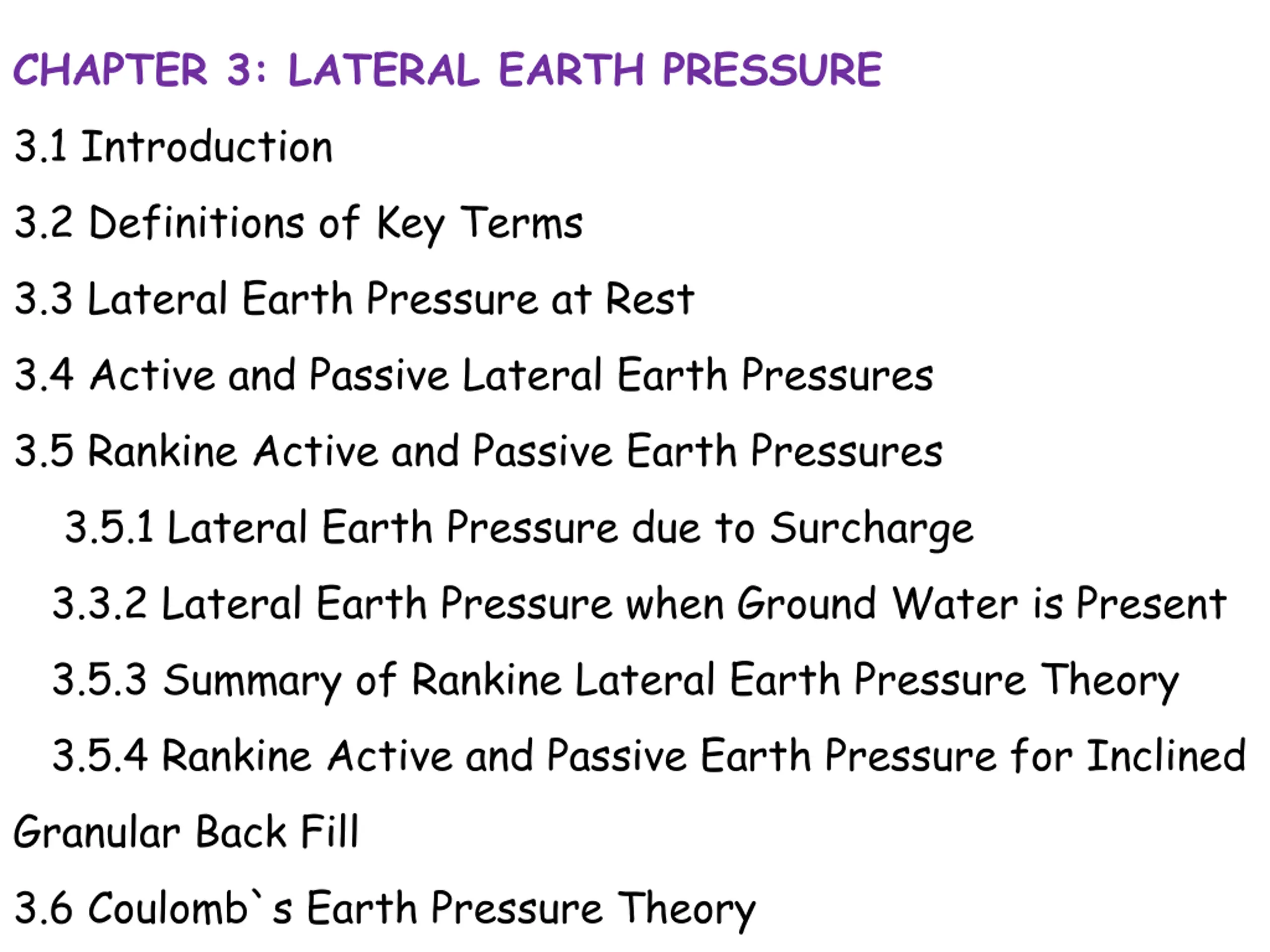 CHAPTER 3: LATERAL EARTH PRESSURE 3.1 Introduction 3.2 Definitions of Key Terms 3.3 Lateral Earth Pressure at Rest 3.4 Active and Passive Lateral Earth Pressures 3.5 Rankine Active and Passive Earth Pressures 3.5.1 Lateral Earth Pressure due to Surcharge 3.3.2 Lateral Earth Pressure when Ground Water is Present 3.5.3 Summary of Rankine Lateral Earth Pressure Theory 3.5.4 Rankine Active and Passive Earth Pressure for Inclined Granular Back Fill 3.6 Coulomb`s Earth Pressure Theory