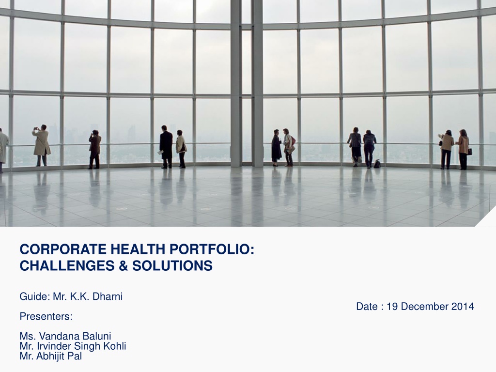 CORPORATE HEALTH PORTFOLIO: CHALLENGES & SOLUTIONS Guide: Mr. K.K. Dharni Date : 19 December 2014 Presenters: Ms. Vandana Baluni Mr. Irvinder Singh Kohli Mr. Abhijit Pal