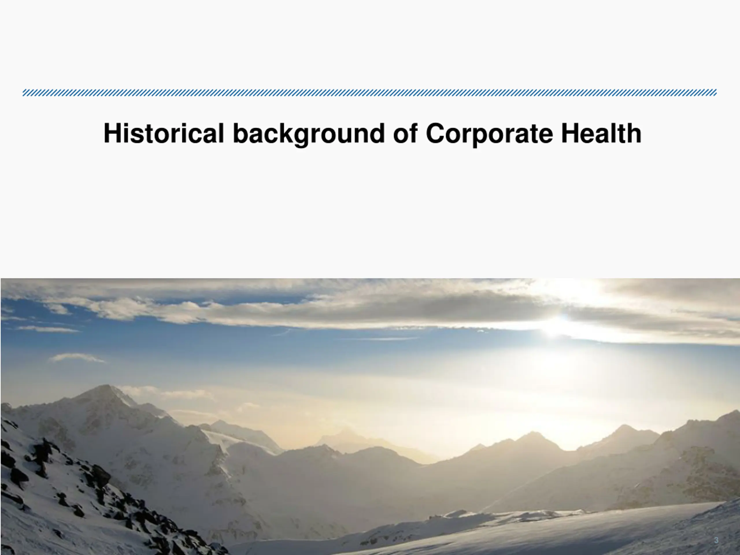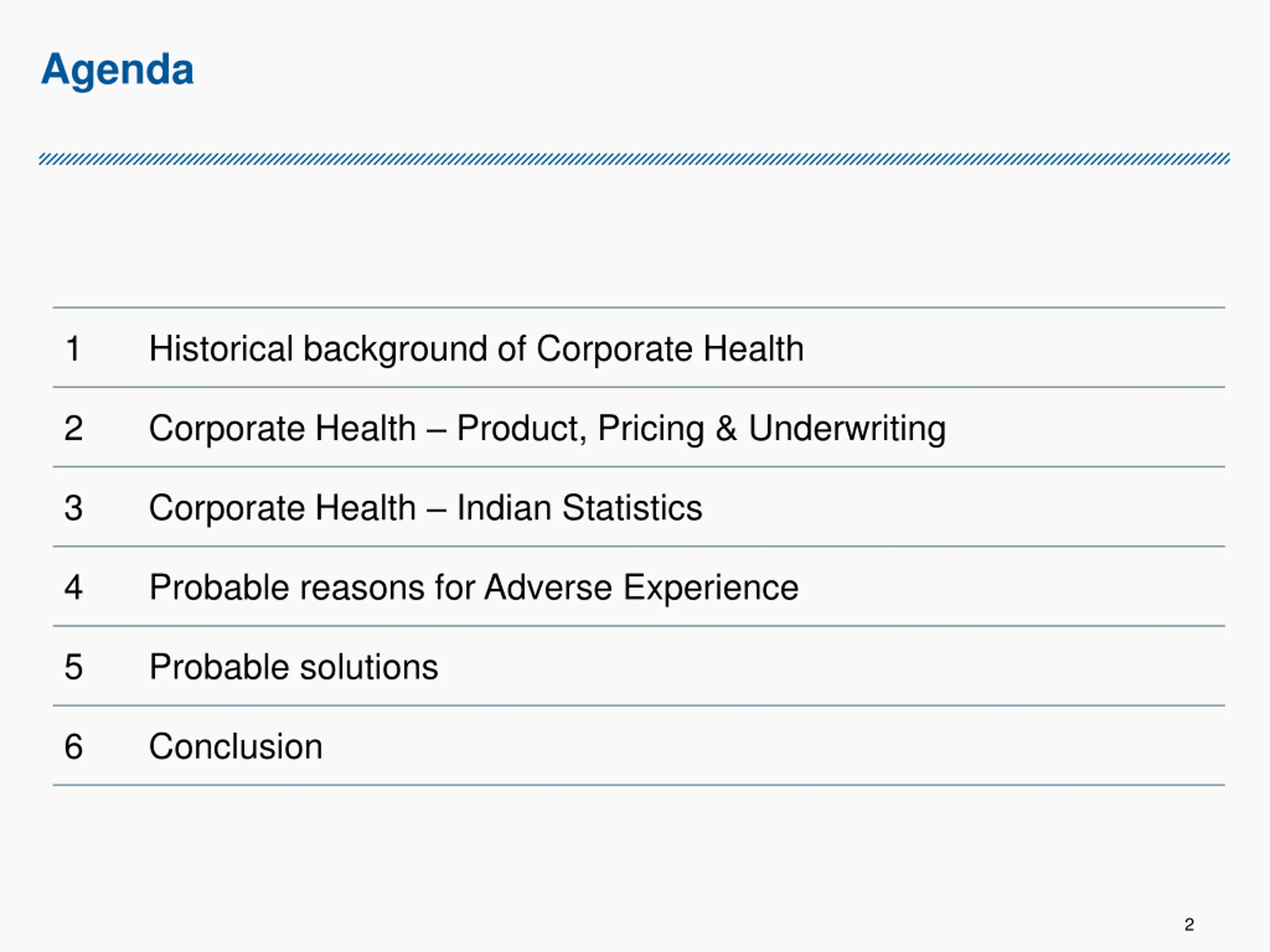 Agenda 1 Historical background of Corporate Health 2 Corporate Health Product, Pricing & Underwriting 3 Corporate Health Indian Statistics 4 Probable reasons for Adverse Experience 5 Probable solutions 6 Conclusion 2