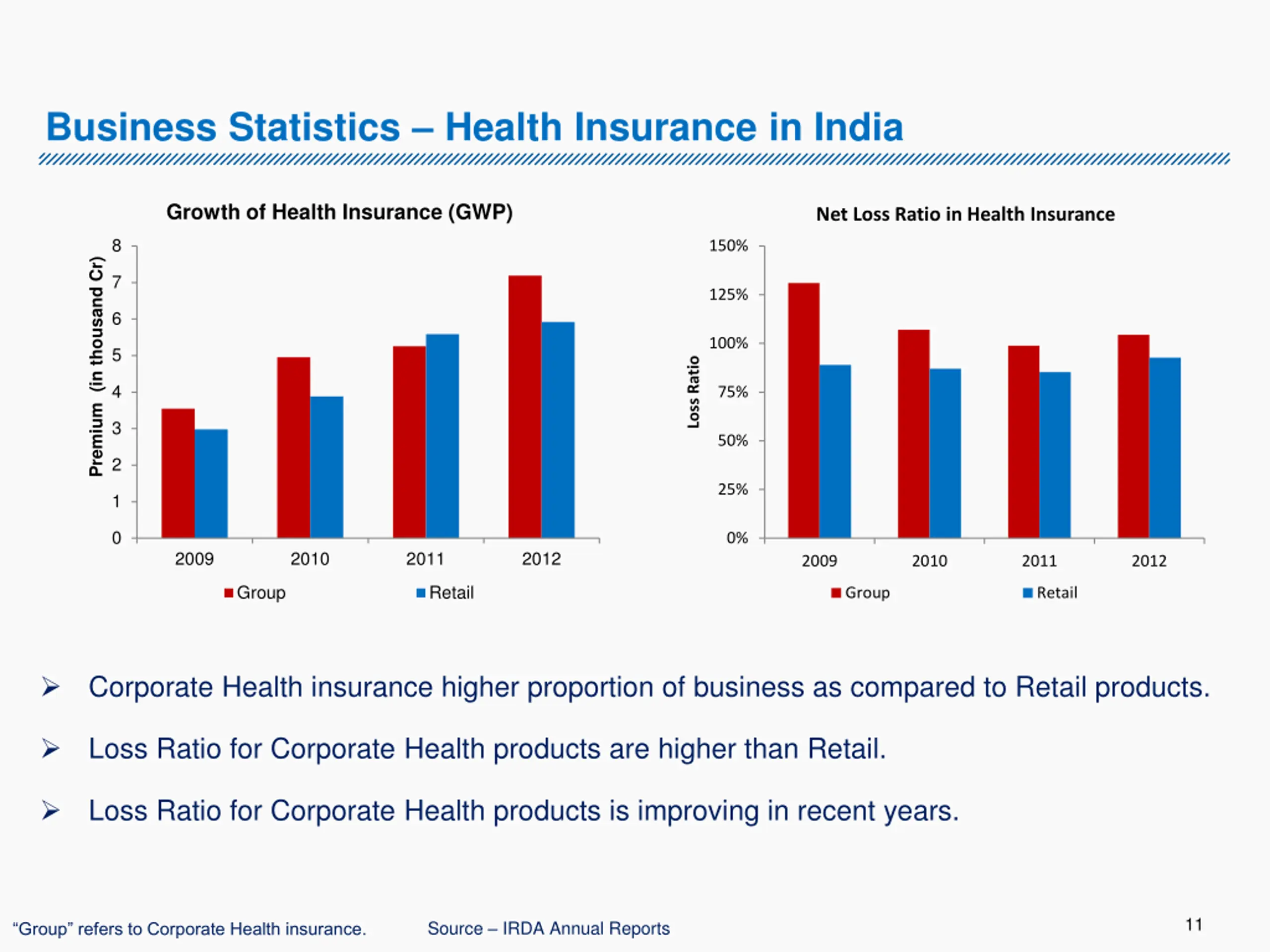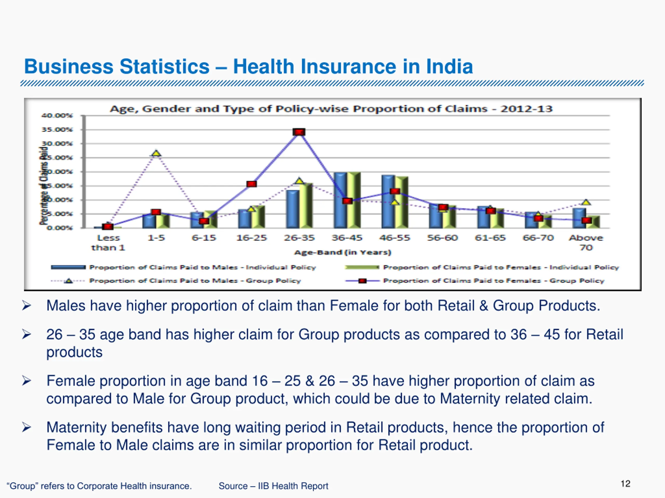 Business Statistics Health Insurance in India Males have higher proportion of claim than Female for both Retail & Group Products. 26 35 age band has higher claim for Group products as compared to 36 45 for Retail products Female proportion in age band 16 25 & 26 35 have higher proportion of claim as compared to Male for Group product, which could be due to Maternity related claim. Maternity benefits have long waiting period in Retail products, hence the proportion of Female to Male claims are in similar proportion for Retail product. 12 Source IIB Health Report Group refers to Corporate Health insurance.