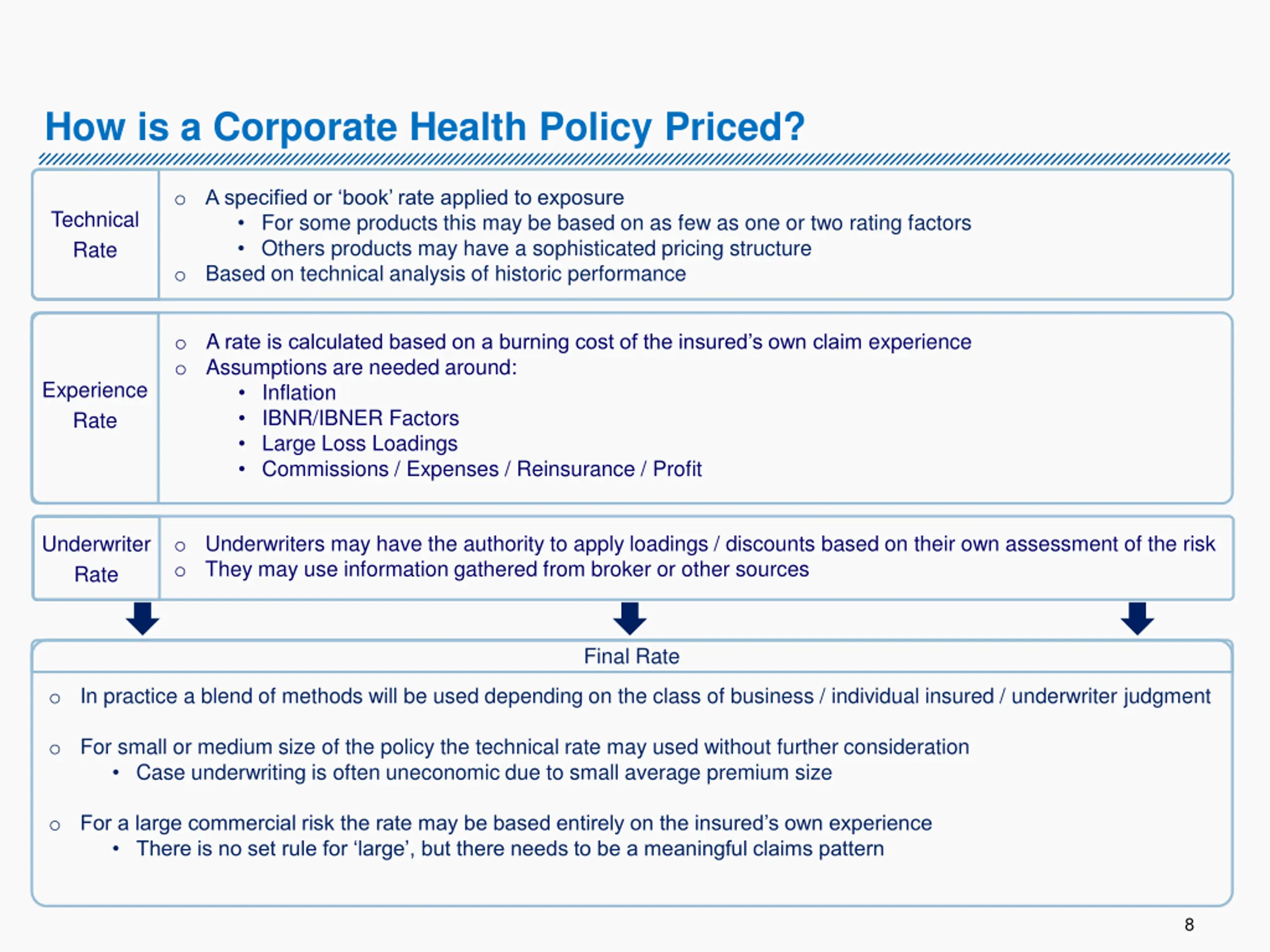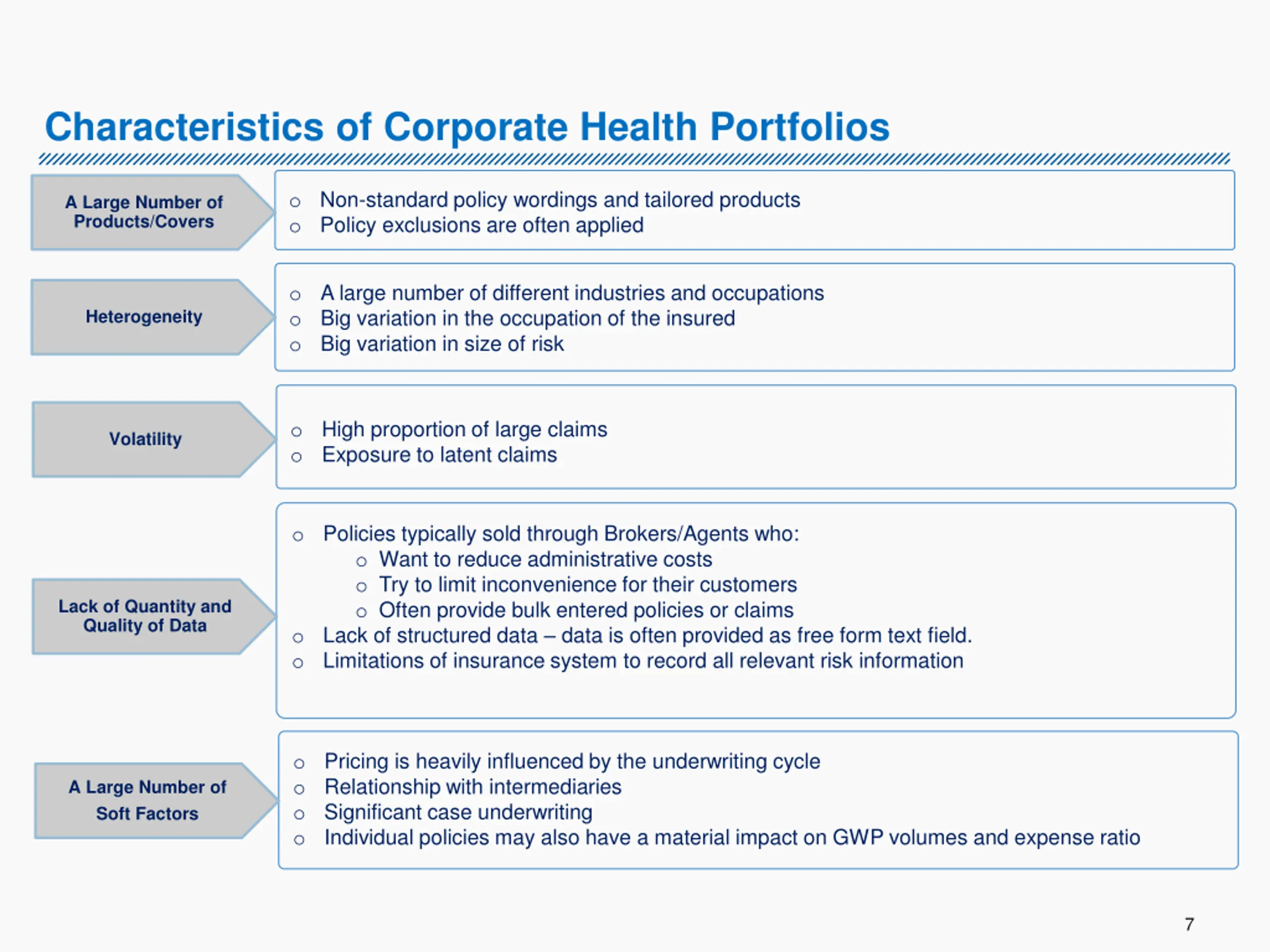 Characteristics of Corporate Health Portfolios o Non-standard policy wordings and tailored products o Policy exclusions are often applied A Large Number of Products/Covers o A large number of different industries and occupations o Big variation in the occupation of the insured o Big variation in size of risk Heterogeneity o High proportion of large claims o Exposure to latent claims Volatility o Policies typically sold through Brokers/Agents who: o Want to reduce administrative costs o Try to limit inconvenience for their customers o Often provide bulk entered policies or claims o Lack of structured data data is often provided as free form text field. o Limitations of insurance system to record all relevant risk information Lack of Quantity and Quality of Data o Pricing is heavily influenced by the underwriting cycle o Relationship with intermediaries o Significant case underwriting o Individual policies may also have a material impact on GWP volumes and expense ratio A Large Number of Soft Factors 7
