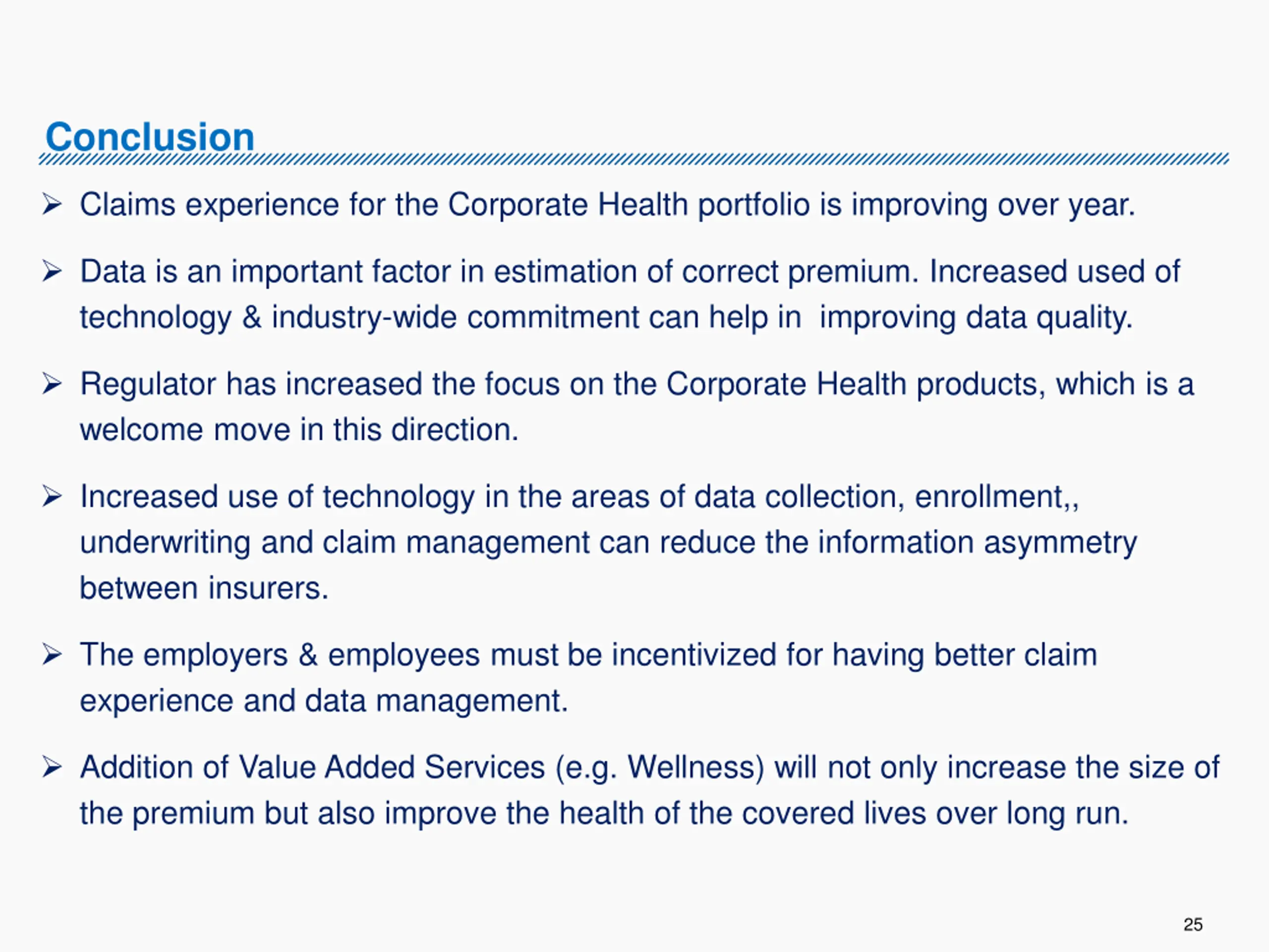 Conclusion Claims experience for the Corporate Health portfolio is improving over year. Data is an important factor in estimation of correct premium. Increased used of technology & industry-wide commitment can help in improving data quality. Regulator has increased the focus on the Corporate Health products, which is a welcome move in this direction. Increased use of technology in the areas of data collection, enrollment,, underwriting and claim management can reduce the information asymmetry between insurers. The employers & employees must be incentivized for having better claim experience and data management. Addition of Value Added Services (e.g. Wellness) will not only increase the size of the premium but also improve the health of the covered lives over long run. 25