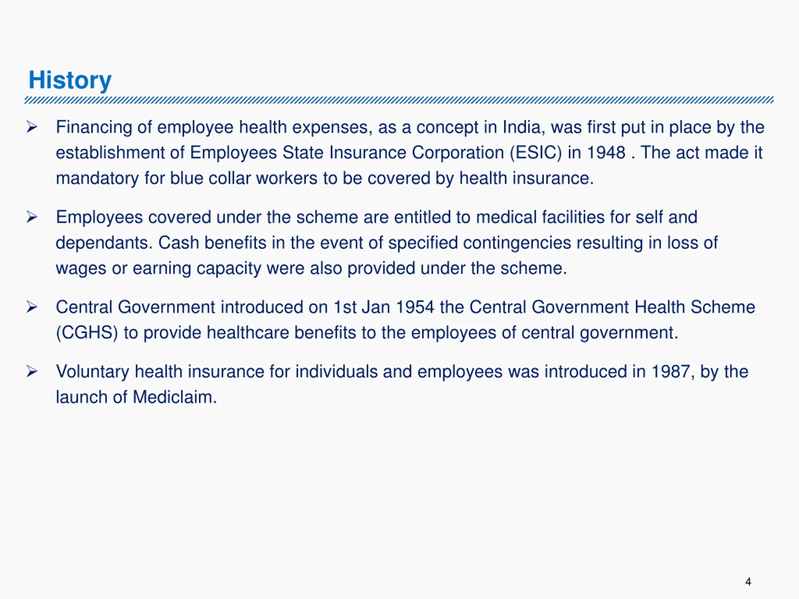 History Financing of employee health expenses, as a concept in India, was first put in place by the establishment of Employees State Insurance Corporation (ESIC) in 1948 . The act made it mandatory for blue collar workers to be covered by health insurance. Employees covered under the scheme are entitled to medical facilities for self and dependants. Cash benefits in the event of specified contingencies resulting in loss of wages or earning capacity were also provided under the scheme. Central Government introduced on 1st Jan 1954 the Central Government Health Scheme (CGHS) to provide healthcare benefits to the employees of central government. Voluntary health insurance for individuals and employees was introduced in 1987, by the launch of Mediclaim. 4