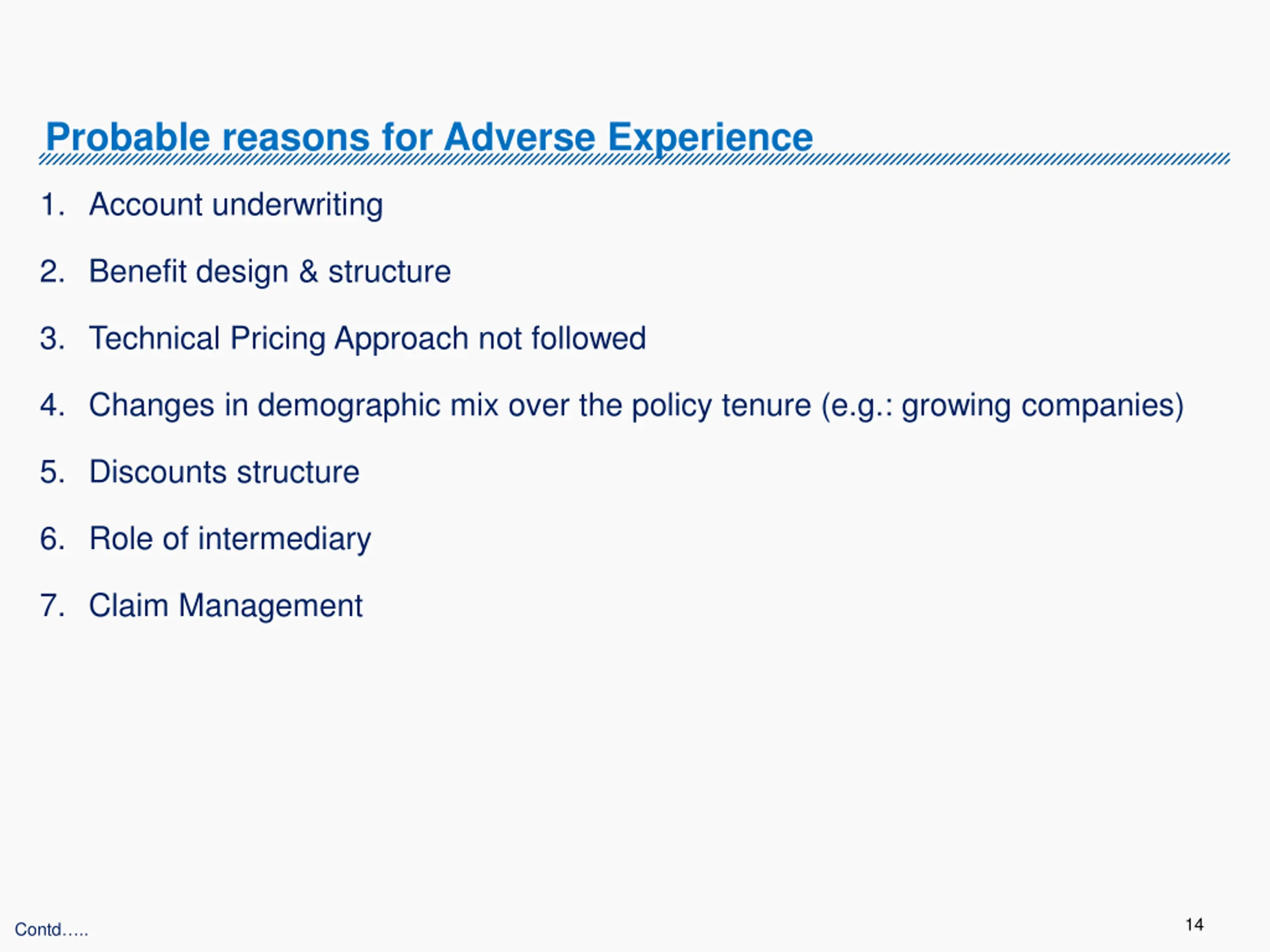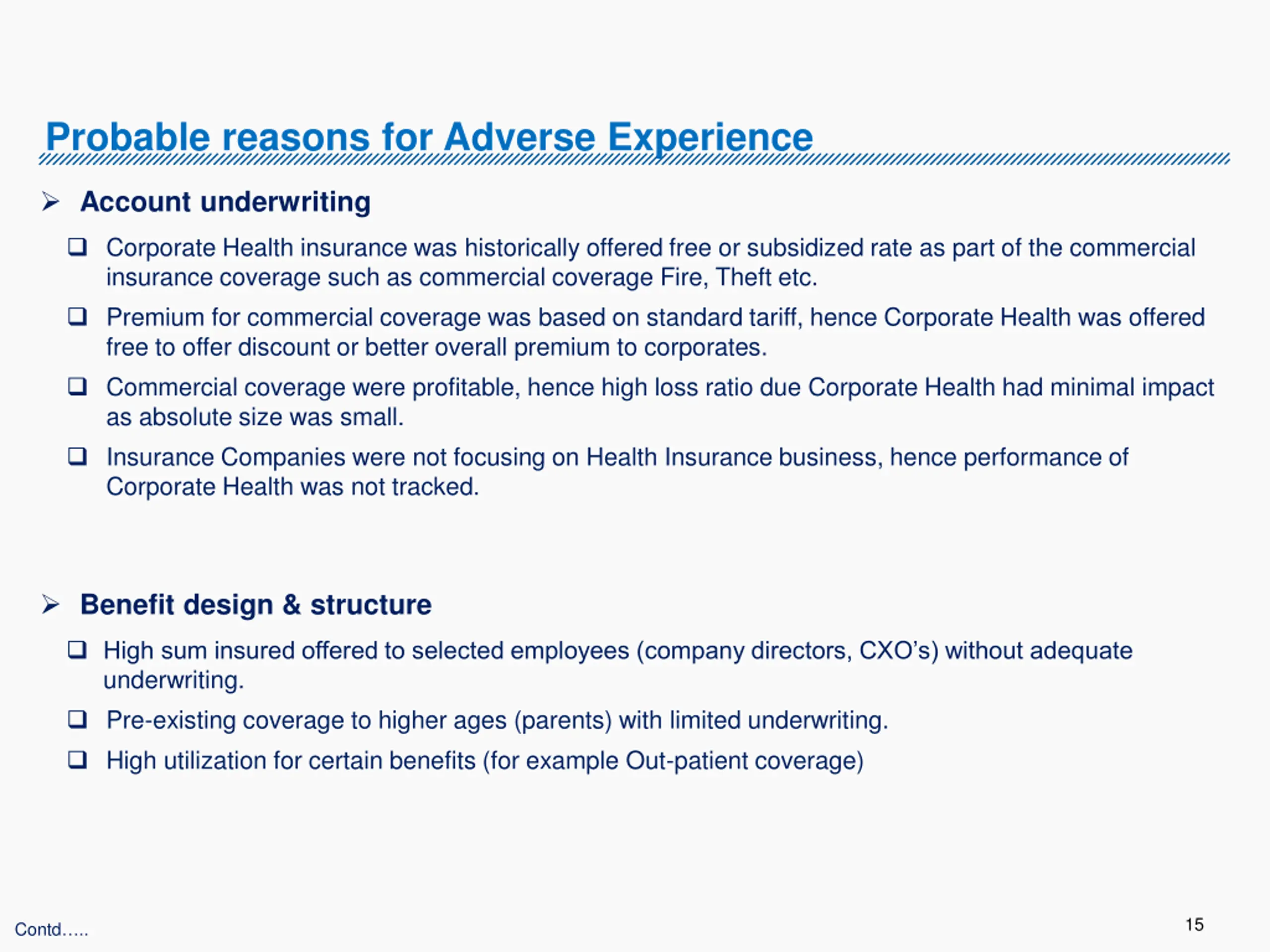 Probable reasons for Adverse Experience 1. Account underwriting 2. Benefit design & structure 3. Technical Pricing Approach not followed 4. Changes in demographic mix over the policy tenure (e.g.: growing companies) 5. Discounts structure 6. Role of intermediary 7. Claim Management 14 Contd ..