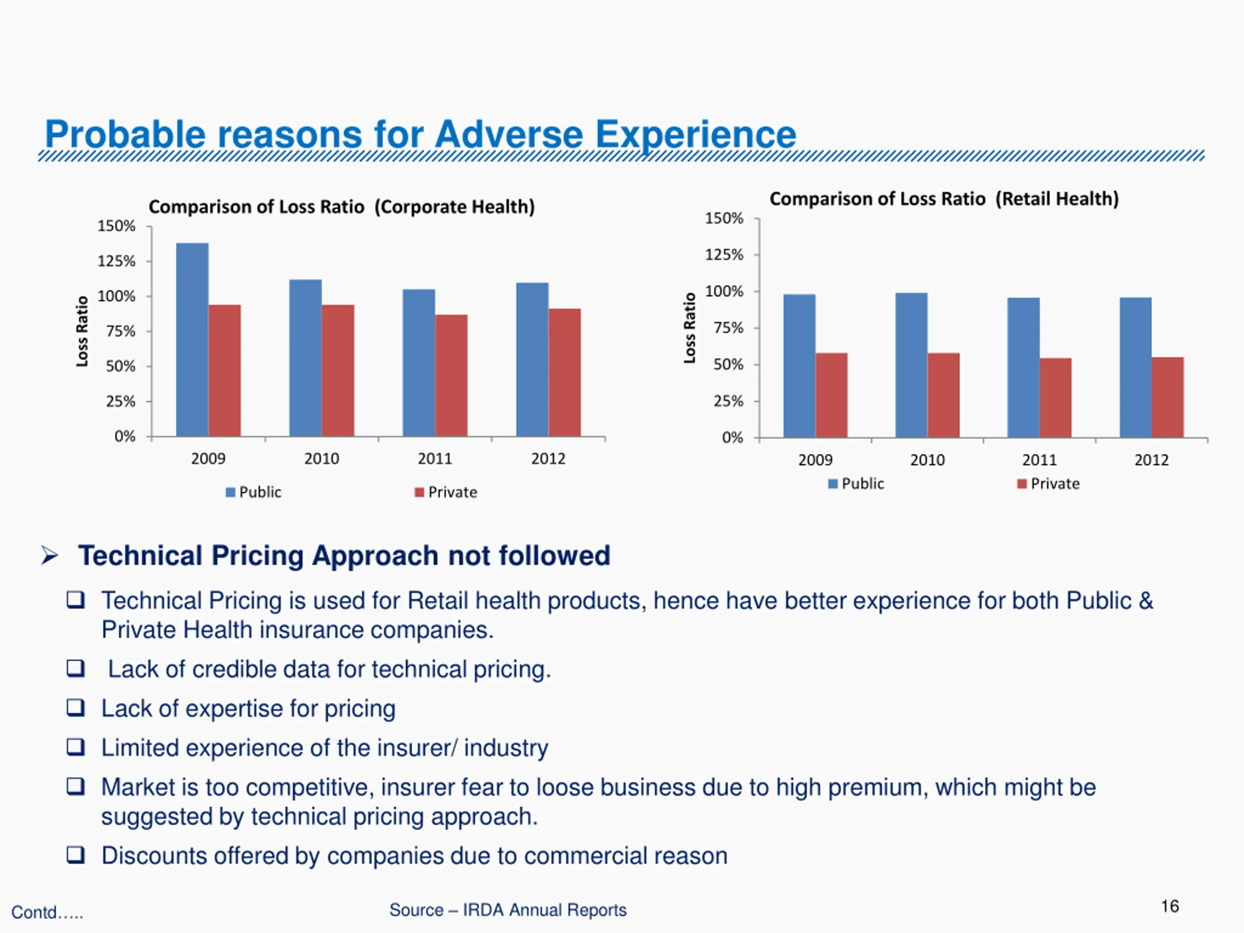 Probable reasons for Adverse Experience Account underwriting Corporate Health insurance was historically offered free or subsidized rate as part of the commercial insurance coverage such as commercial coverage Fire, Theft etc. Premium for commercial coverage was based on standard tariff, hence Corporate Health was offered free to offer discount or better overall premium to corporates. Commercial coverage were profitable, hence high loss ratio due Corporate Health had minimal impact as absolute size was small. Insurance Companies were not focusing on Health Insurance business, hence performance of Corporate Health was not tracked. Benefit design & structure High sum insured offered to selected employees (company directors, CXO s) without adequate underwriting. Pre-existing coverage to higher ages (parents) with limited underwriting. High utilization for certain benefits (for example Out-patient coverage) 15 Contd ..