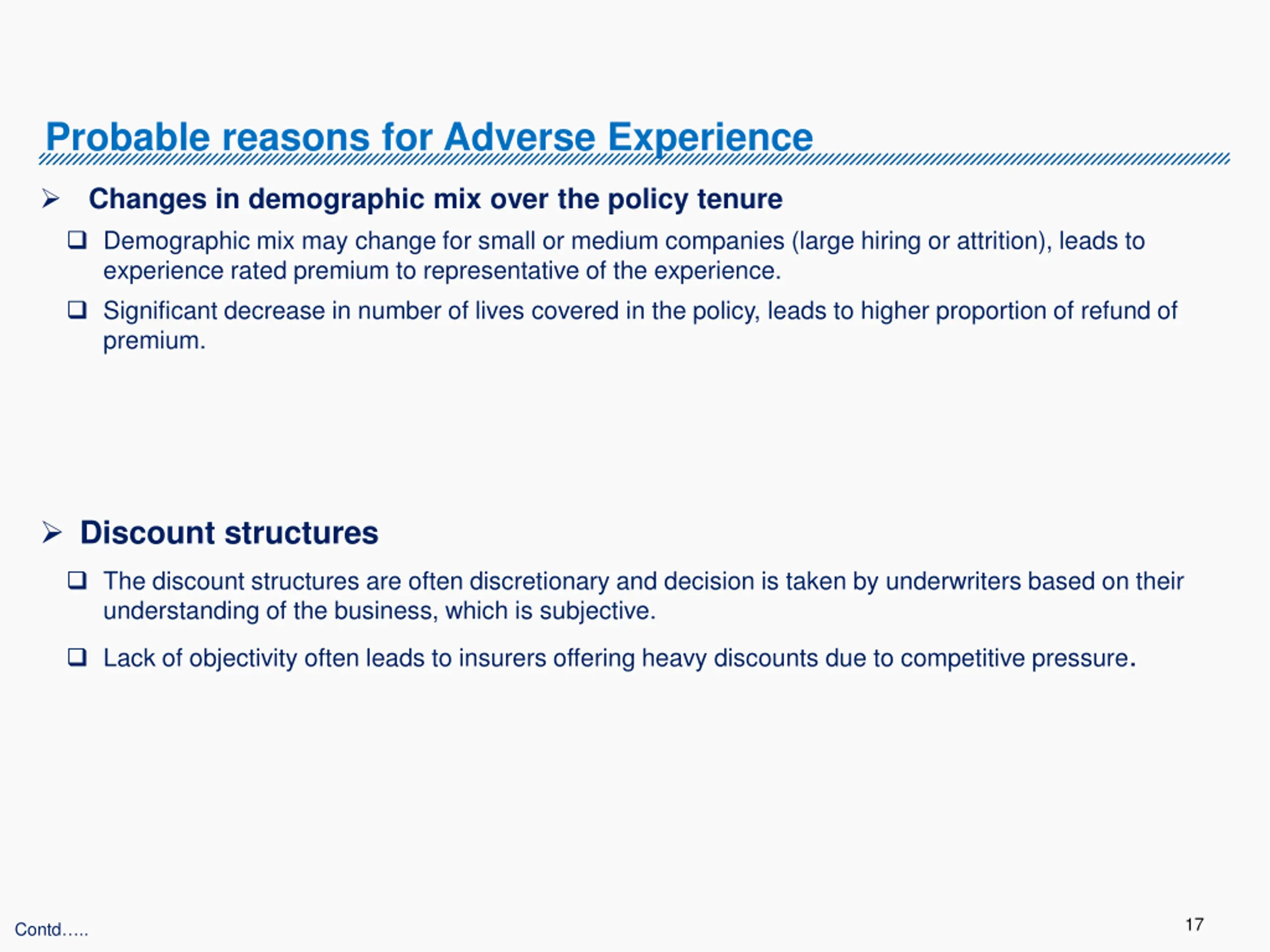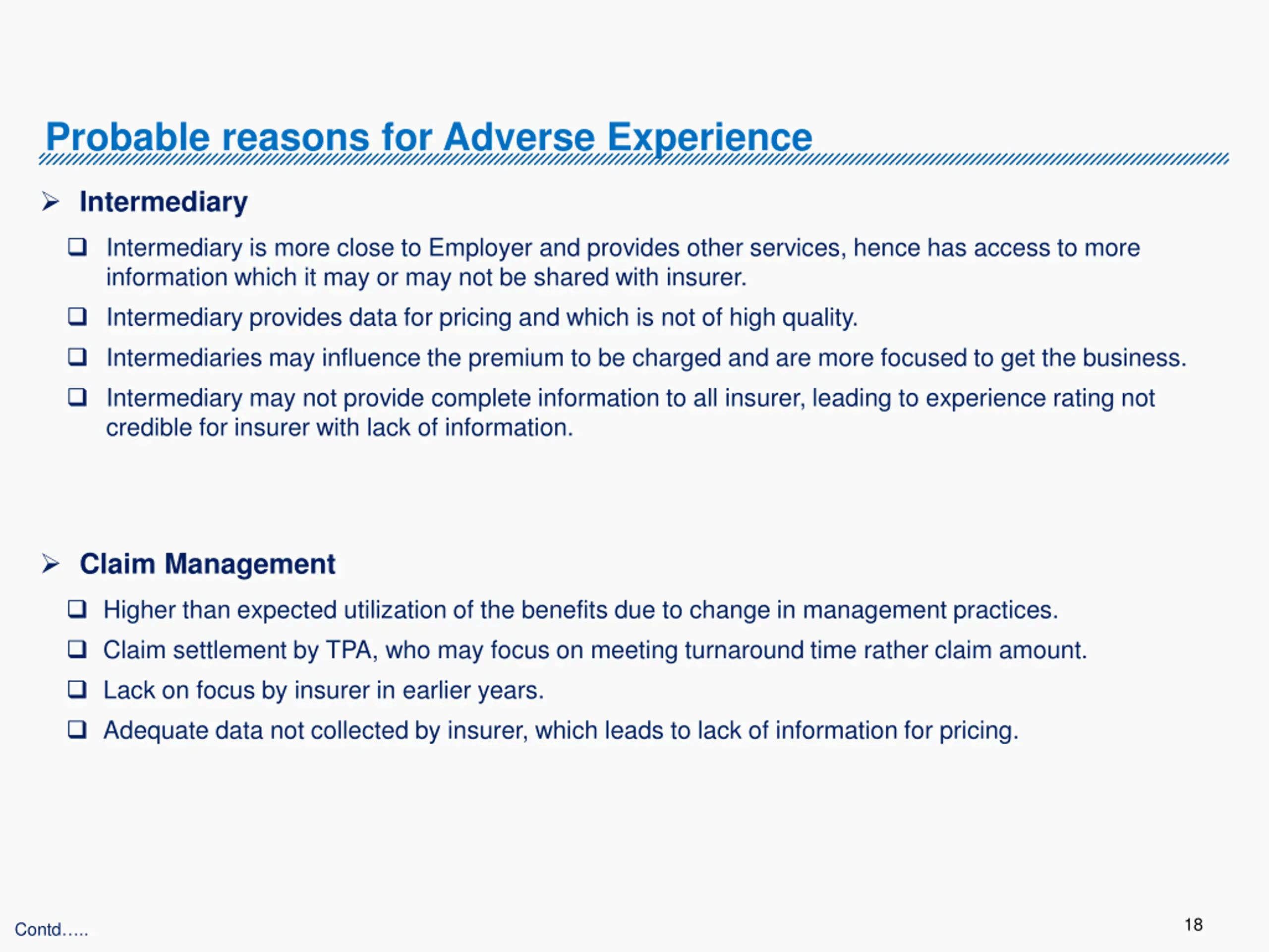 Probable reasons for Adverse Experience Changes in demographic mix over the policy tenure Demographic mix may change for small or medium companies (large hiring or attrition), leads to experience rated premium to representative of the experience. Significant decrease in number of lives covered in the policy, leads to higher proportion of refund of premium. Discount structures The discount structures are often discretionary and decision is taken by underwriters based on their understanding of the business, which is subjective. Lack of objectivity often leads to insurers offering heavy discounts due to competitive pressure. 17 Contd ..