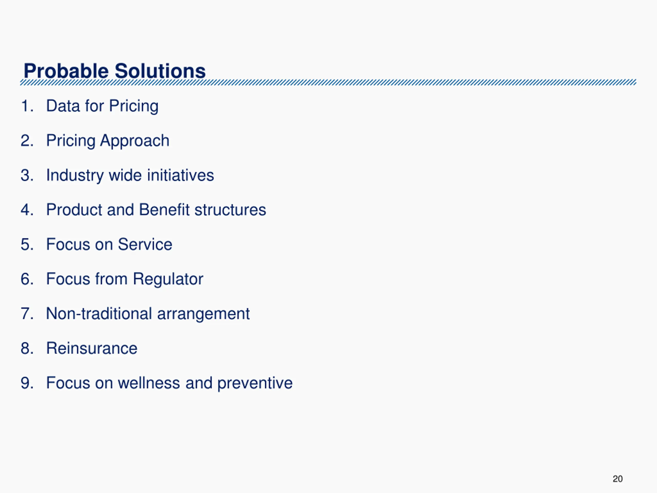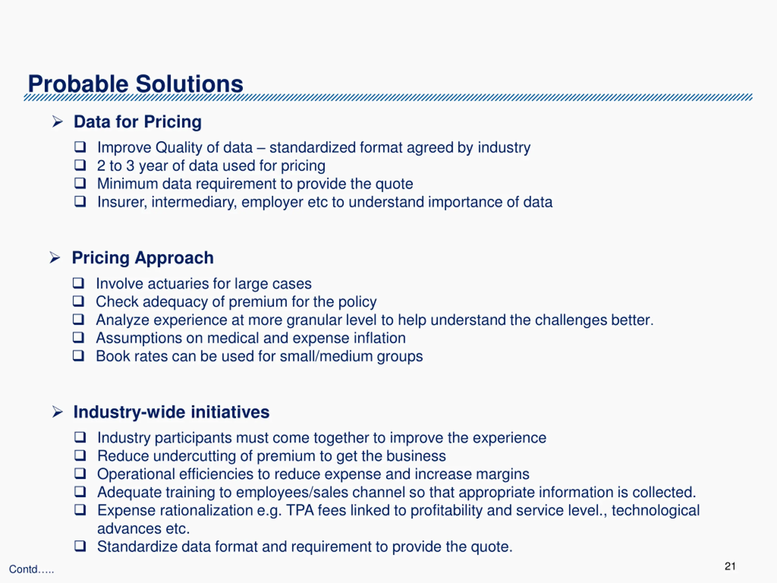 Probable Solutions 1. Data for Pricing 2. Pricing Approach 3. Industry wide initiatives 4. Product and Benefit structures 5. Focus on Service 6. Focus from Regulator 7. Non-traditional arrangement 8. Reinsurance 9. Focus on wellness and preventive 20