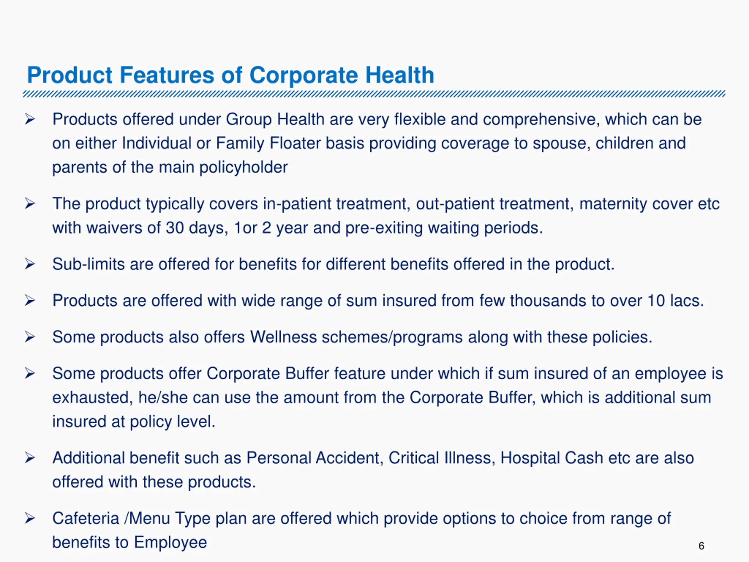 Product Features of Corporate Health Products offered under Group Health are very flexible and comprehensive, which can be on either Individual or Family Floater basis providing coverage to spouse, children and parents of the main policyholder The product typically covers in-patient treatment, out-patient treatment, maternity cover etc with waivers of 30 days, 1or 2 year and pre-exiting waiting periods. Sub-limits are offered for benefits for different benefits offered in the product. Products are offered with wide range of sum insured from few thousands to over 10 lacs. Some products also offers Wellness schemes/programs along with these policies. Some products offer Corporate Buffer feature under which if sum insured of an employee is exhausted, he/she can use the amount from the Corporate Buffer, which is additional sum insured at policy level. Additional benefit such as Personal Accident, Critical Illness, Hospital Cash etc are also offered with these products. Cafeteria /Menu Type plan are offered which provide options to choice from range of benefits to Employee 6
