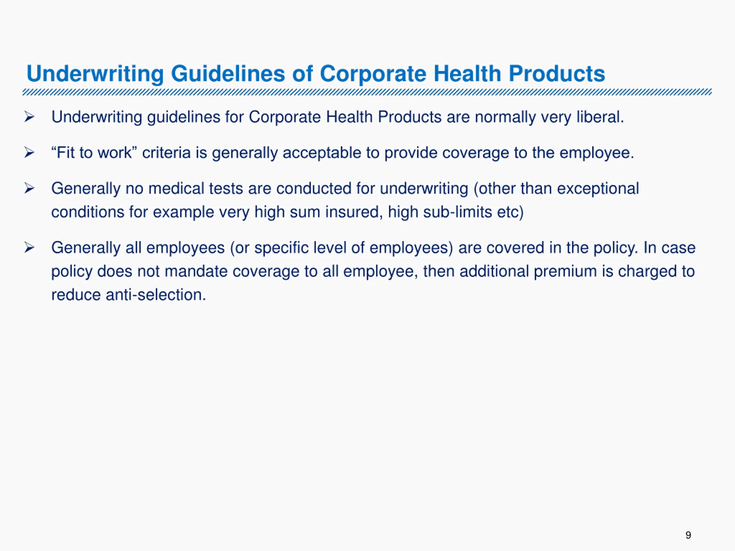 Underwriting Guidelines of Corporate Health Products Underwriting guidelines for Corporate Health Products are normally very liberal. Fit to work criteria is generally acceptable to provide coverage to the employee. Generally no medical tests are conducted for underwriting (other than exceptional conditions for example very high sum insured, high sub-limits etc) Generally all employees (or specific level of employees) are covered in the policy. In case policy does not mandate coverage to all employee, then additional premium is charged to reduce anti-selection. 9