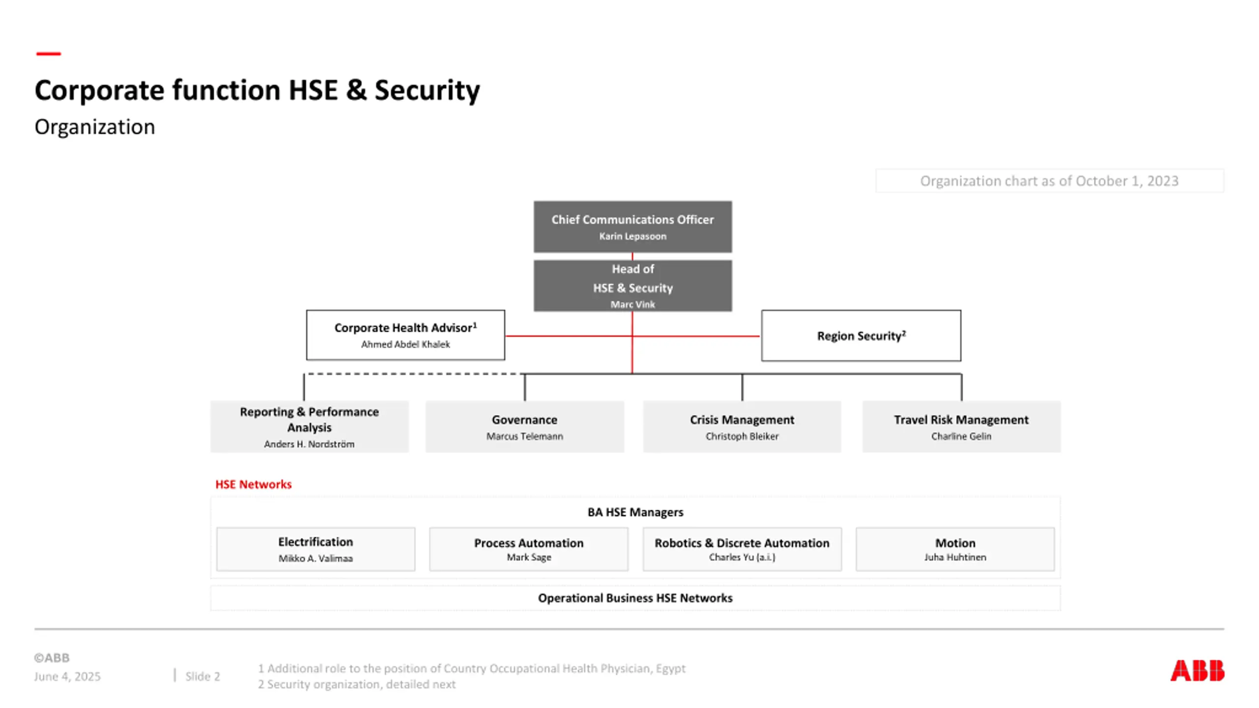 Corporate function HSE & Security Organization Organization chart as of October 1, 2023 Chief Communications Officer Karin Lepasoon Head of HSE & Security Marc Vink Corporate Health Advisor1 Ahmed Abdel Khalek Region Security2 Reporting & Performance Analysis Anders H. Nordstr m Governance Marcus Telemann Crisis Management Christoph Bleiker Travel Risk Management Charline Gelin HSE Networks BA HSE Managers Electrification Mikko A. Valimaa Process Automation Mark Sage Robotics & Discrete Automation Charles Yu (a.i.) Motion Juha Huhtinen Operational Business HSE Networks 1 Additional role to the position of Country Occupational Health Physician, Egypt 2 Security organization, detailed next Slide 2 June 4, 2025