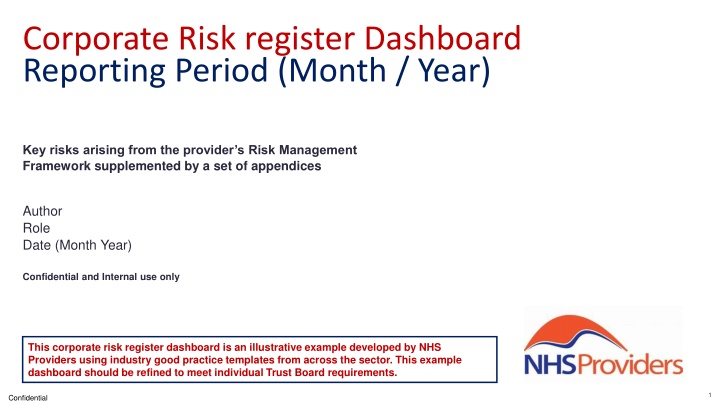 Corporate Risk register Dashboard Reporting Period (Month / Year) Key risks arising from the provider s Risk Management Framework supplemented by a set of appendices Author Role Date (Month Year) Confidential and Internal use only This corporate risk register dashboard is an illustrative example developed by NHS Providers using industry good practice templates from across the sector. This example dashboard should be refined to meet individual Trust Board requirements. 1 Confidential